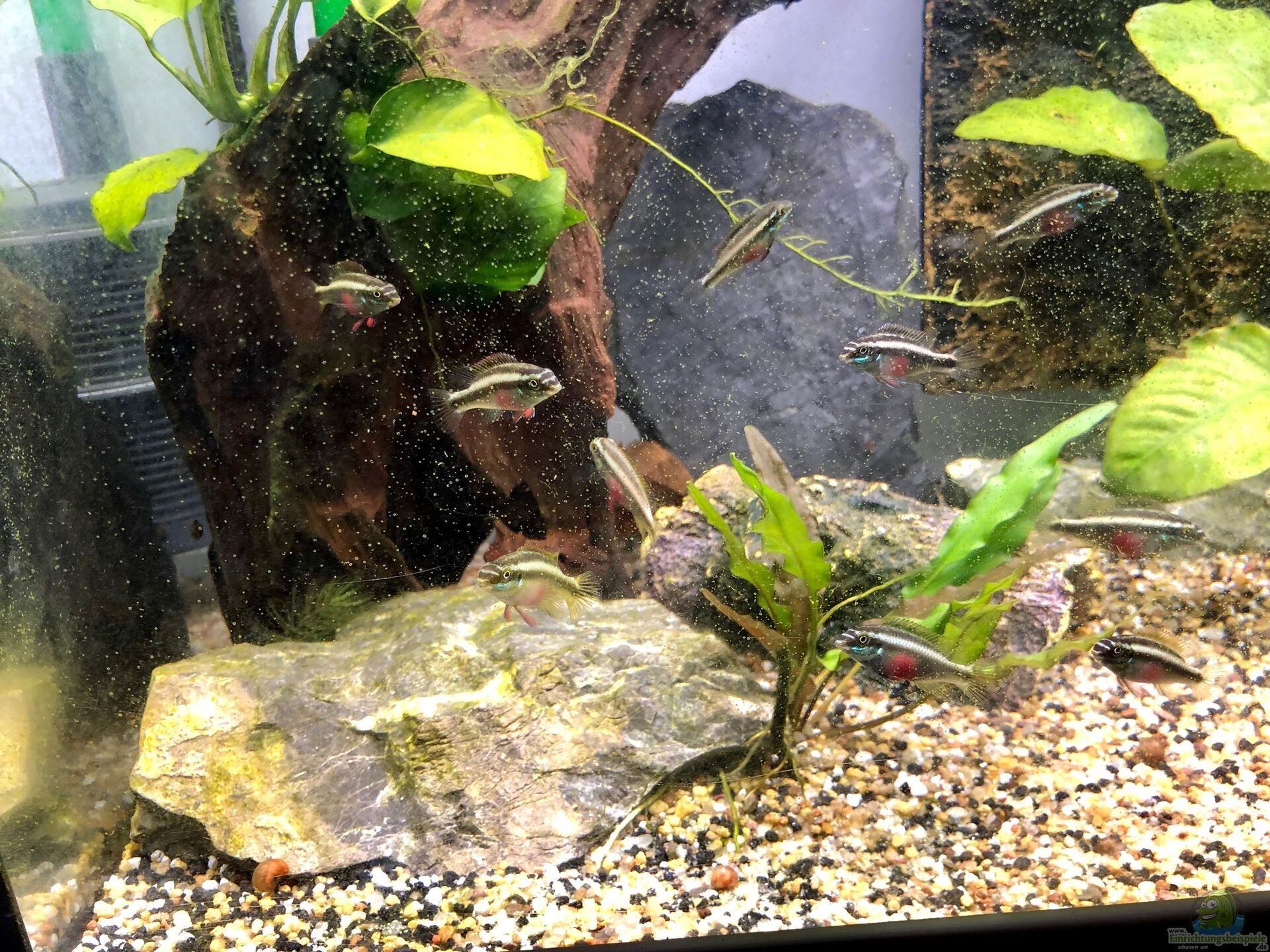 Und die Fische? Die tun in diesem Becken sehr gut und die Farben entwickeln sich gro??artig. Es ist immer eine Freude, in das Becken zu sehen und den jungen Pelvichachromis sacrimontis RED zuzusehen. Die Jungen des zweiten Wurfs kommen demnächst in das Becken mit der LED Aquaristik Beleuchtung hinzu. Die Eltern im anderen Becken, in dem noch die Jungtiere des zweiten Wurfs leben, wollten schon wieder zweimal zur Brut schreiten, doch sie haben es aufgrund der verbliebenen Jungtiere wieder gelassen. Auch wenn die Pelvicachromis sacrimontis RED bei uns selten sind ??? eine Jungfisch-??berschwemmung möchte ich nicht produzieren???
