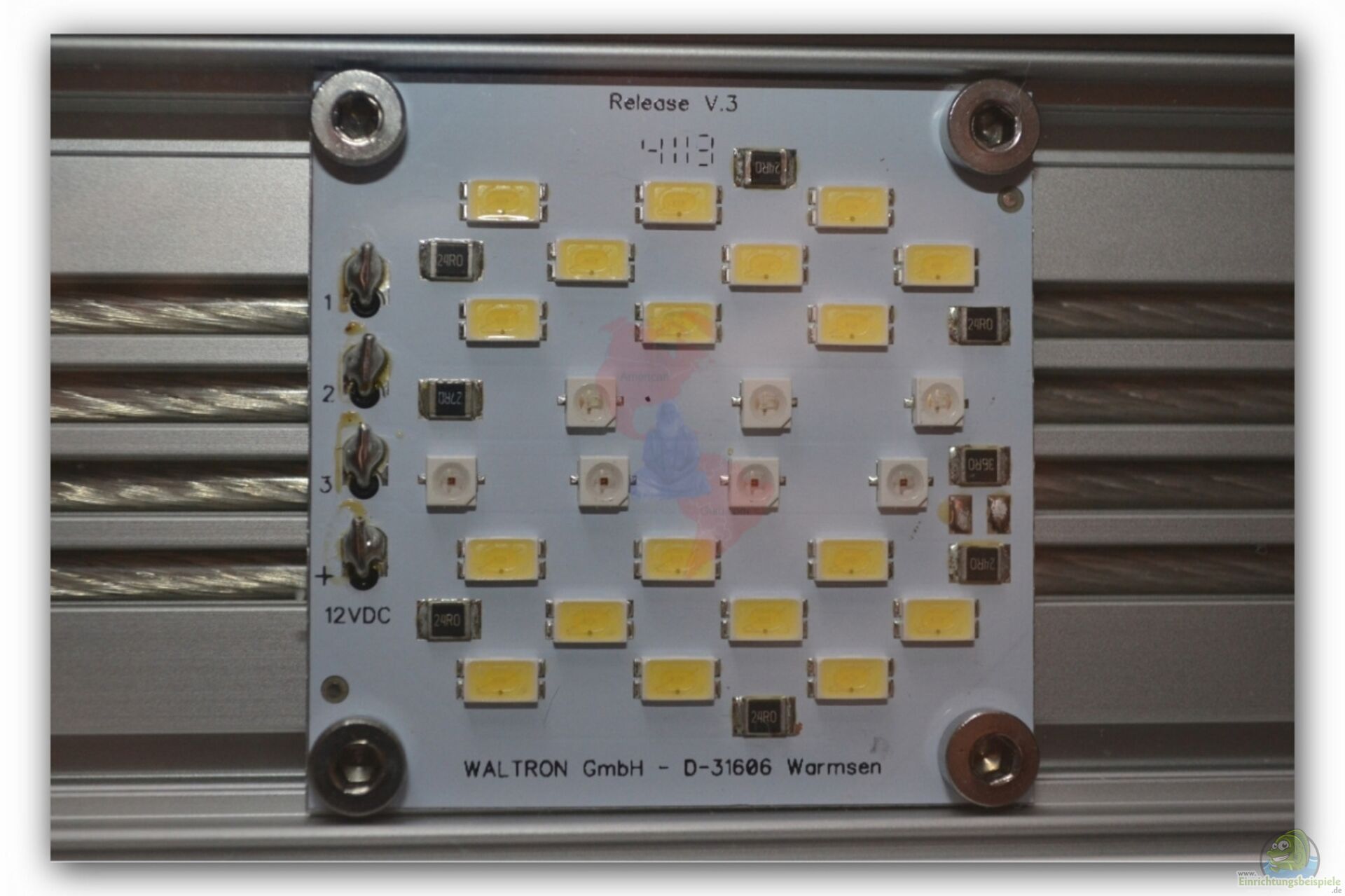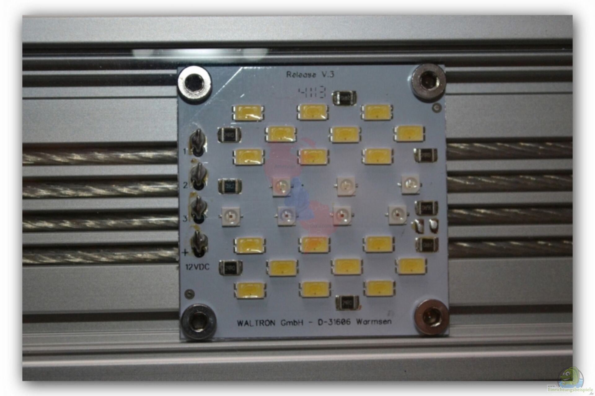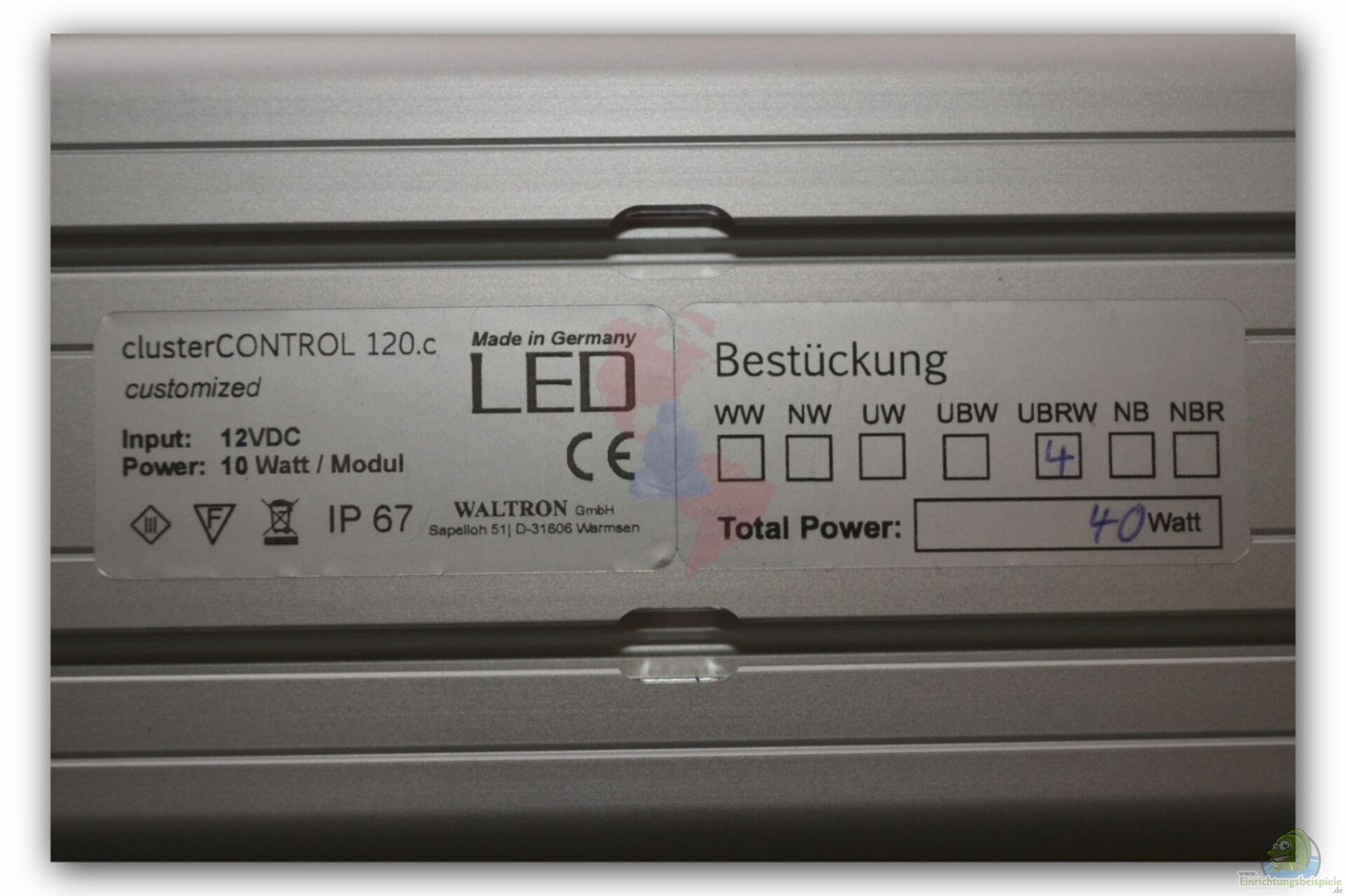Die Standardbestückung einer 120er sind normalerweise 3 (120.3) Cluster a 10Watt, bestücken kann man sie aber mit max. 6 Clustern a 10W. Dies liegt daran, da?? die thermischen Eigenschaften des Aluprofils so berechnet sind, dass man alle 20cm einen Cluster aufbauen darf, dabei wird die Lampe dann nicht über 40 Grad warm, was aber nicht hei??t, dass man an den Abstand von 20cm gebunden ist, sondern lediglich an die Anzahl der Cluster. Die Firma Waltron gestattet es dem Kunden den Abstand der Cluster an die Gegebenheiten im Aquarium durch Verschieben beliebig anzupassen, sogar die Cluster direkt zusammenzuschieben.