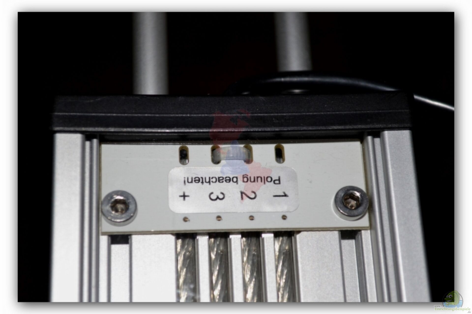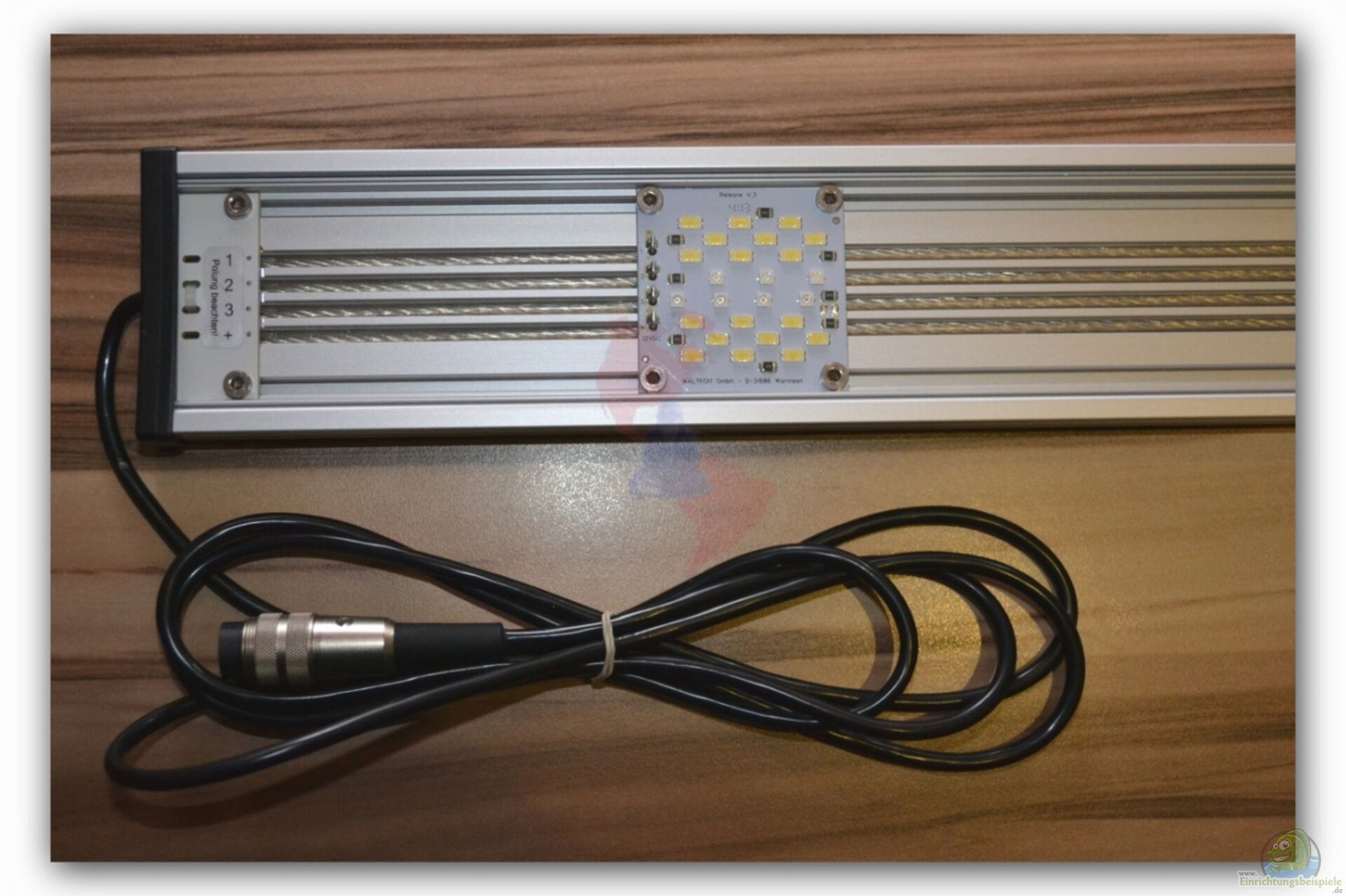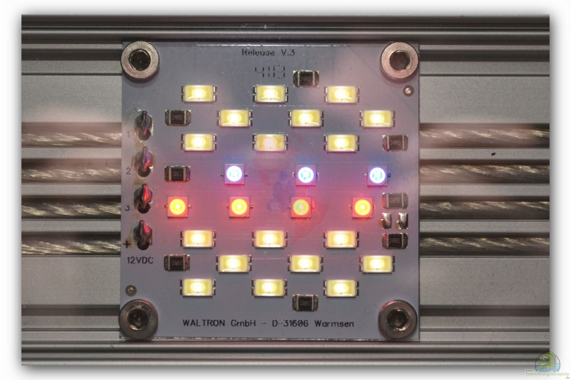 Die Standardbestückung einer 120er sind normalerweise 3 (120.3) Cluster a 10Watt, bestücken kann man sie aber mit max. 6 Clustern a 10W. Dies liegt daran, da?? die thermischen Eigenschaften des Aluprofils so berechnet sind, dass man alle 20cm einen Cluster aufbauen darf, dabei wird die Lampe dann nicht über 40 Grad warm, was aber nicht hei??t, dass man an den Abstand von 20cm gebunden ist, sondern lediglich an die Anzahl der Cluster. Die Firma Waltron gestattet es dem Kunden den Abstand der Cluster an die Gegebenheiten im Aquarium durch Verschieben beliebig anzupassen, sogar die Cluster direkt zusammenzuschieben.
