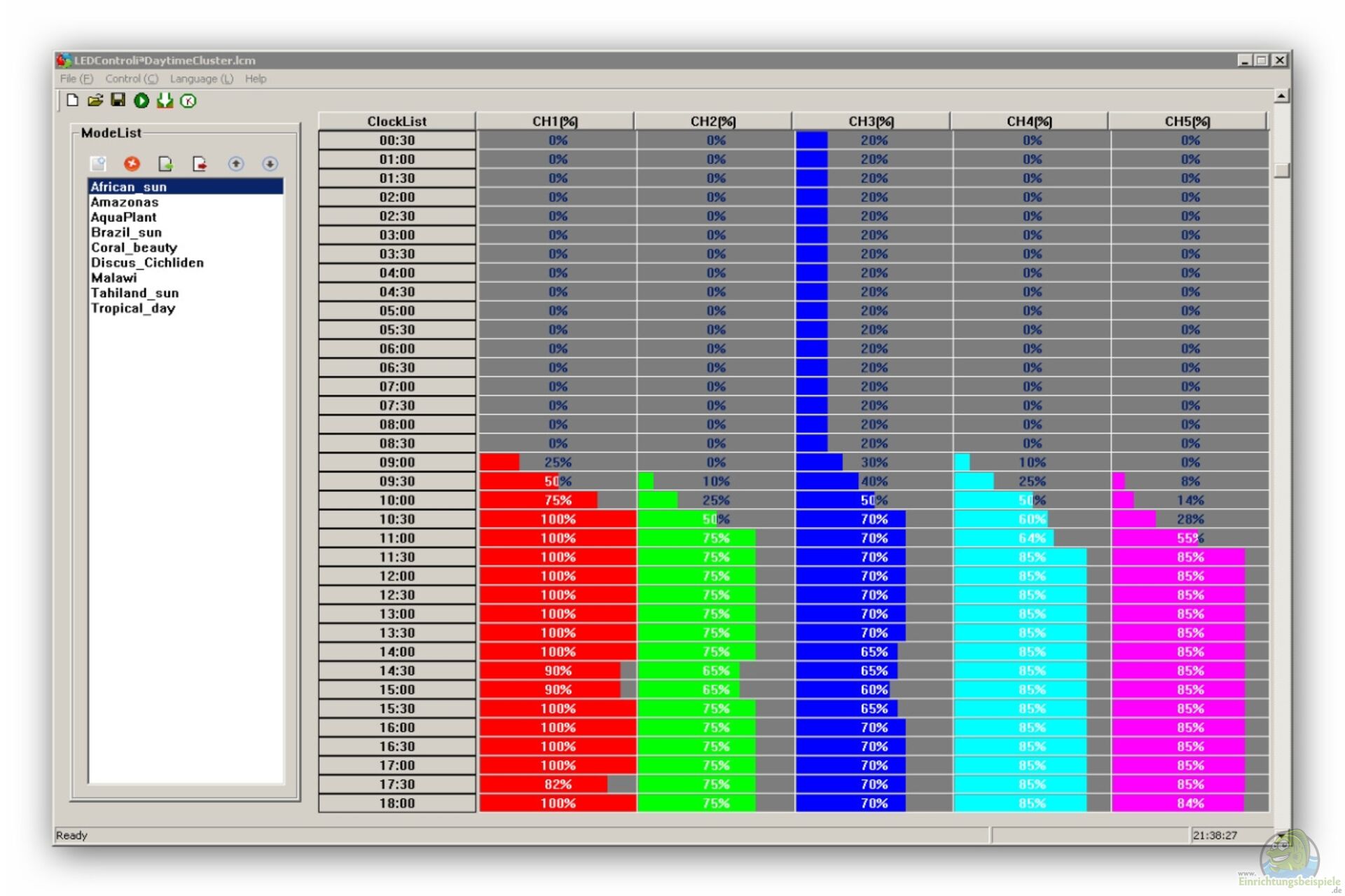 Mit dem Easy Time Controll (ECT® ) lassen sich sehr einfach Sonnenauf- & Sonnenuntergänge, Helligkeitsschwankungen wie bei einem Wolkenspiel und natürlich auch ein Mondlicht simulieren. Bei diesem Controller kann alle halbe Stunde ein neuer Schritt programmiert werden, das macht pro Kanal also 48 Schritte, was bei 5 Kanälen insgesammt 240 Programmschritten entspricht. Die Programmierung der breits vorgegebenen Zeiten, alle 30 Minuten 5 Werte, kann sehr einfach per Maus erfolgen, oder mittels der 4 Cursortasten, wobei Hoch/Runter immer vollen 10 Minuten entspricht und Links/Rechts immer den Minuten.