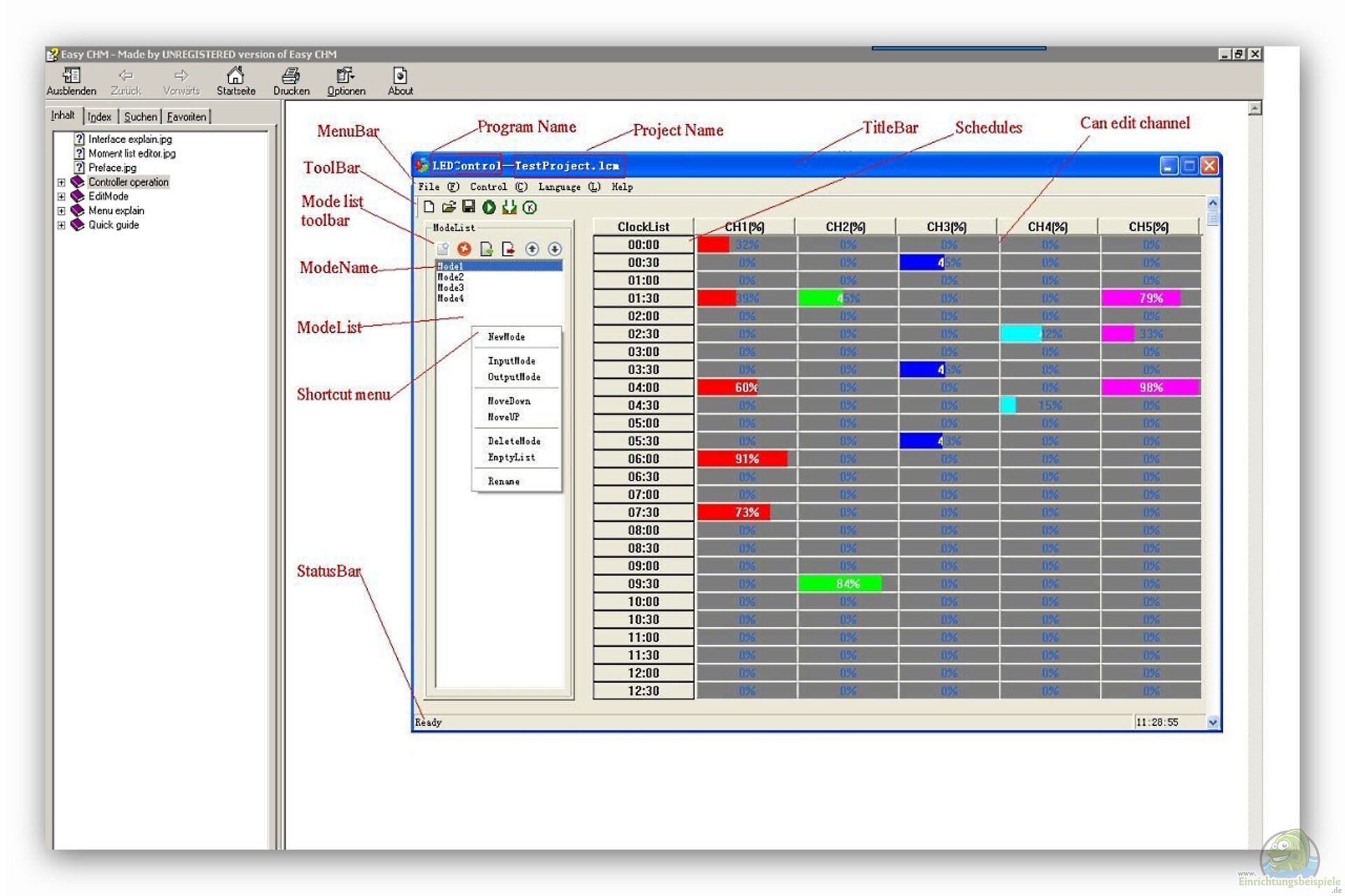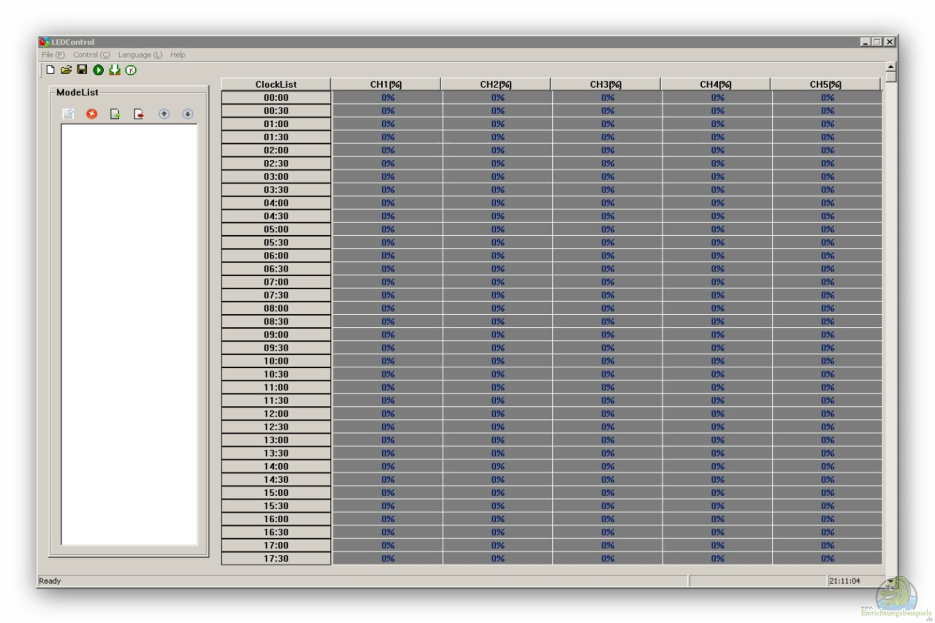Mittels der Software können zig verschiedene Programme generiert werden, die dann alle gemeinsam in den Controller geladen werden können. Ein solcher Tagesablauf (Mode) besteht aus je 240 Einzelschritten, bei 5 Kanäle, zu je 48 Schritten. Es können Werte zwischen 0 und 100% eingegeben werden, die Uhrzeit ist dabei in halbstündigen Schritten jeweils schon fest vorgegeben.. Mittels der Software können die Tagesabläufe sehr einfach geladen, gespeichert und editiert werden, aber auch Grundeinstellungen des Controllers können vorgenommen werden. Mittels Klick auf das Uhrensymbol kann die Systemzeit des angeschlossenen PC`s sehr einfach und schnell in den Controller übernommen werden, Ein Klicken auf Language ermöglicht leider auch hier nur eine englische, sowie eine chinesischen Auswahlmöglichkeit. Ausserdem ist es natürlich möglich die geladenen Programme im Controller zu Löschen, oder in Stop / Run, usw. zu Setzen. Das fertige Programm kann damit auch auf einem Laufwerk des PC"s gesichert werden, oder im Controller gespeichert und dann abgespielt werden. Wie gesagt es sind mehrere Programme im Controller gleichzeitig möglich die dann manuell ausgewählt und gestartet werdn können. In der Software gibt es ausserdem noch eine Help-Funktion, mit der kompletten Beschreibung des Programms und deren Bedienung, aber leider auch nur wieder in englischer Sprache.
