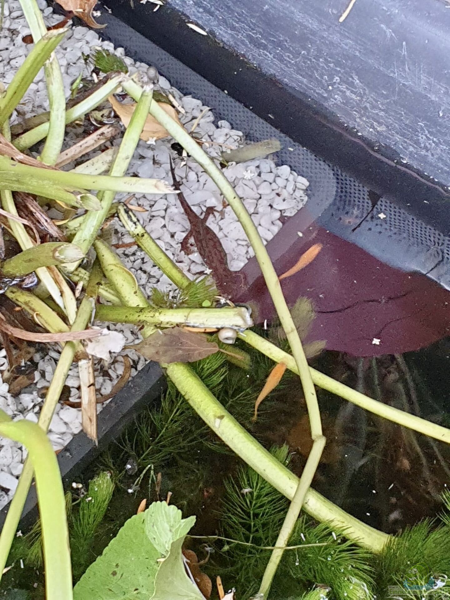 Vielleicht wartet er auch auf Futter, denn die Medaka werden alle zwei Tage mit Flockenfutter und Staubfutter gefüttert. Natürliche Nahrung, wie Wasserinsekten, Mückenlarven, Schnecken und anderes scheint auch genügend in dem Teich zu sein??? Au??erdem befindet sich ein gro??er Komposthaufen nur drei Meter neben dem Teich. Dies sollte nicht au??er Acht gelassen werden, denn hier hat der Molch wohl den optimalen Lebensraum gefunden. Es gibt auch unzählige Weinbergschnecken in dem Garten, die andernorts leider nur mehr selten anzutreffen sind???
