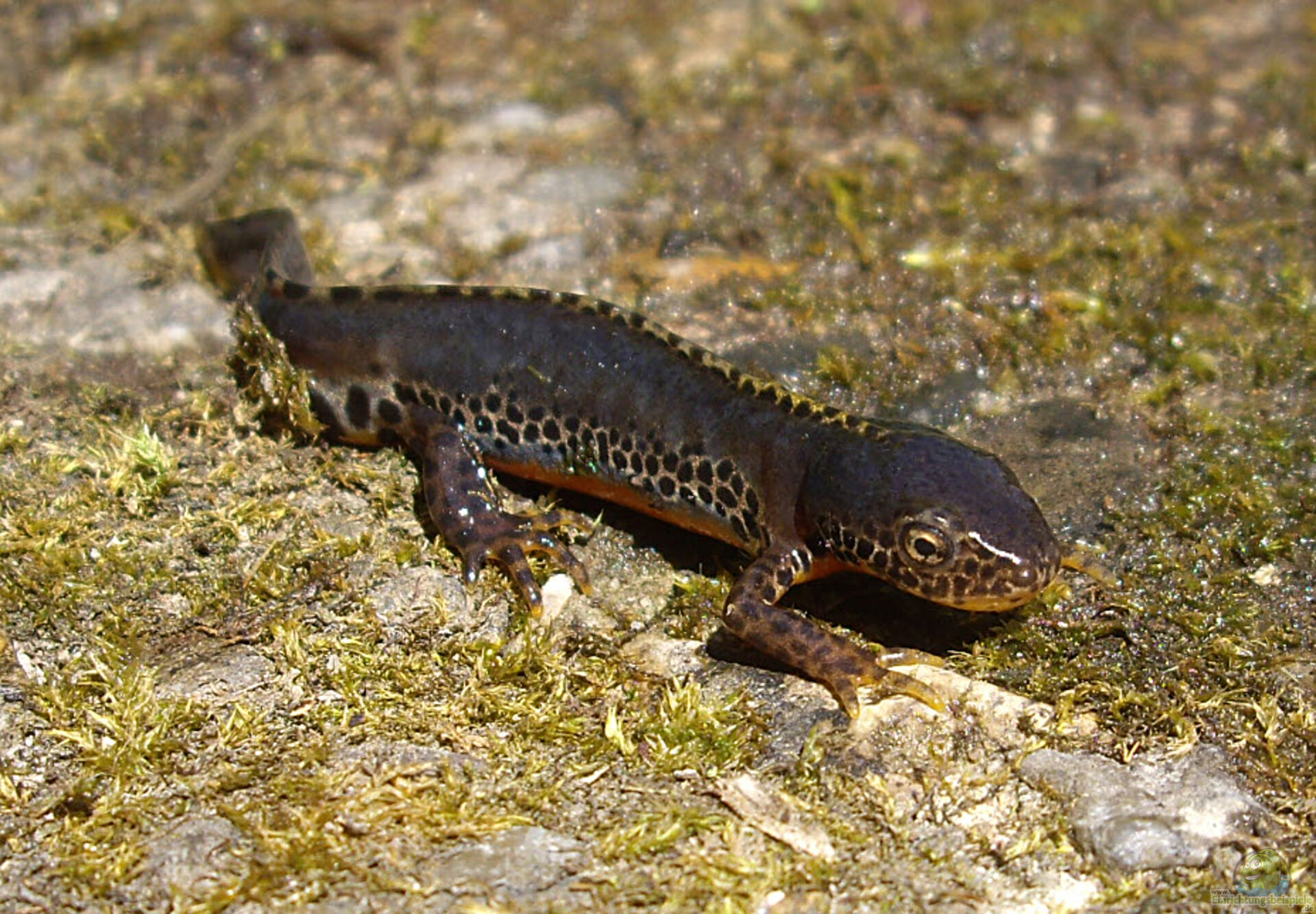 Bergmolch: Zieht sich oft an Land zurück, wo er Verstecke unter Laub, Totholz oder in Erdspalten aufsucht, um den Winter zu überstehen.