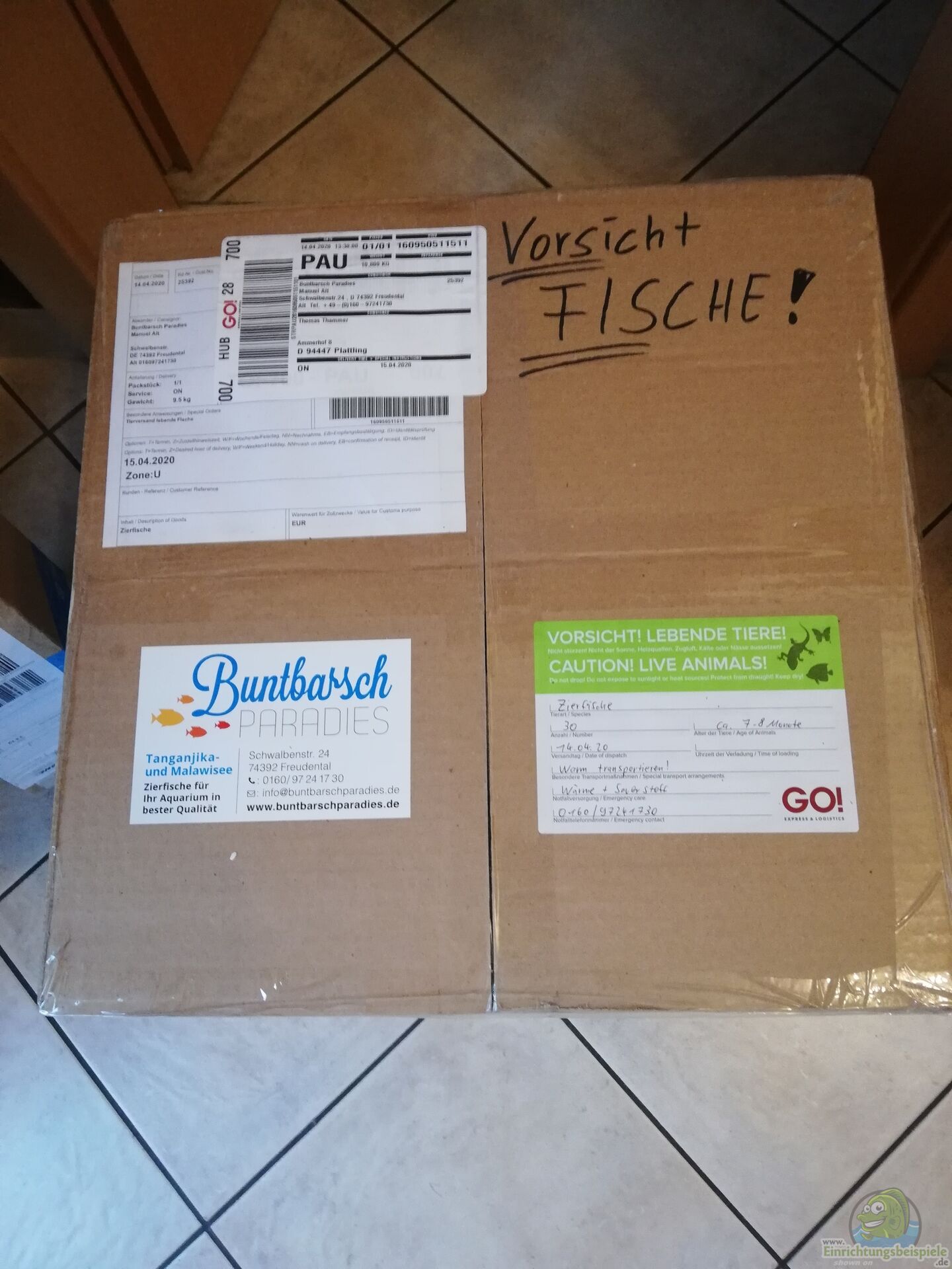 Zur Vorgeschichte: Eigentlich hat das Buntbarschparadies im Marktplatz von www.einrichtungsbeispiele.de Tropheus Katonga, die früheren Ujiji angeboten. Mit dieser Art war ich vor vielen Jahren in die Haltung von Tropheus-Cichliden eingestiegen und lange Zeit war ein Foto dieser Art auch das Titelbild von Einrichtungsbeispiele.de. Leider war zu diesem Zeitpunkt die Witterung winterlich kühl und der Versand aus meiner Sicht nicht unbedingt möglich. Den ersten Pluspunkt hat sich das Buntbarschparadies bereits an der Stelle verdient. Der Kauf und Versand fanden zu dieser Zeit nicht statt. Jetzt ist das Wetter wieder besser und ich wollte die Buntbarsche bestellen. Leider inzwischen nicht mehr vorhanden, aber eine Gruppe Tropheus chaitika wurde mir angeboten und schwubs waren 30 Tiere bestellt. Erster möglicher Versandtag nach Ostern terminiert. Gestern am Nachmittag die kurze Emailinfo, das GO die Abholung bestätigt hätte und schon am nächsten Morgen, also heute um kurz nach 7 Uhr stand auch schon der Fahrer mit dem Paket vor der Türe. GO kommt bei mir immer um diese Zeit. Wesentlich früher als andere Express-Dienste, die in der Vergangenheit auch schon mal bis in den späten Nachmittag hinein gebraucht haben. Diesmal also alles optimal gelaufen. Von der Verpackung war ich dann sehr angetan. Die Styroporbox ist standard, dass alle Tüten gut verschlossen sind, ist ebenfalls üblich. Diesmal neben einem Heatpack aber noch eine Neuigkeit für mich: In der Box war eine zusätzliche Wärmefolie, wie man sie als Rettungsdecke kennt, um die Fischtüten gehüllt. Besser kann man es wahrscheinlich nicht machen.