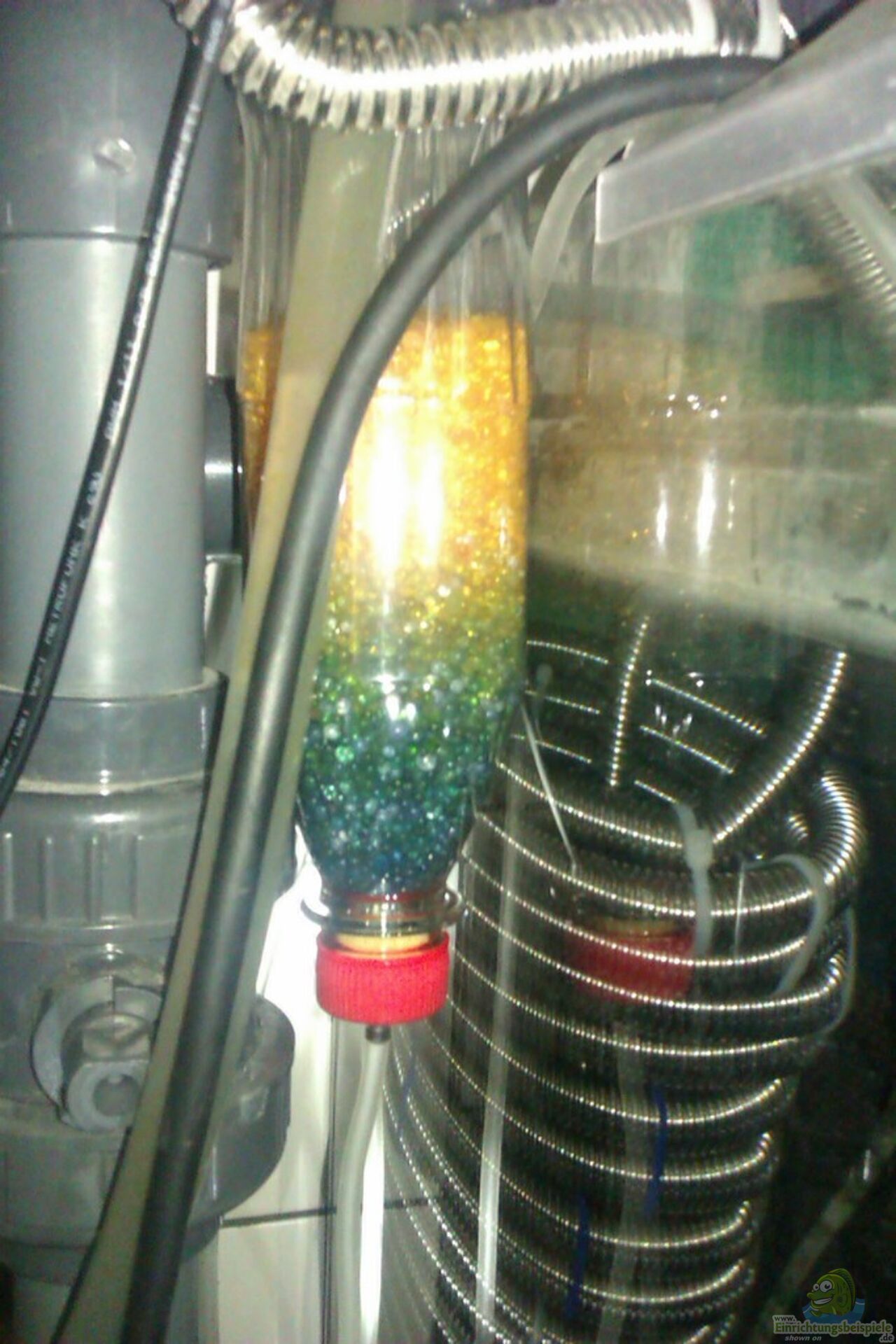 5. Ich habe sie kopfüber aufgehängt und einen kleinen Filterschwammwürfel in den Deckel gesteckt, damit das Silikat nicht die Zuleitung verstopft.
