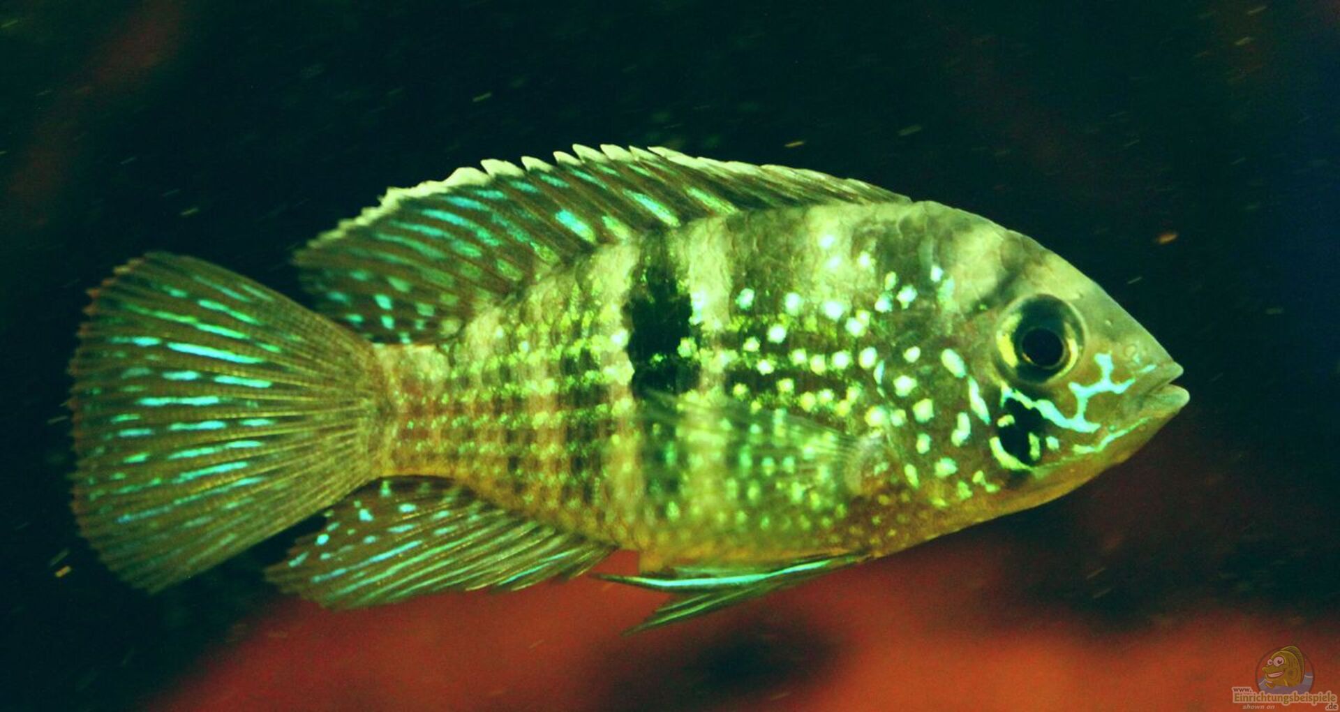 Dieser wunderschöne Cichlide der in einem türkisblauen Kleid welches mit vielen Punkten gesäumt ist daher kommt kann schon in Becken ab 300 Litern paarweise gepflegt werden, möchte man diesen Tieren aber dauerhaft gerecht werden sollte das Aqua eine Kantenlänge von 150 cm aufweisen.