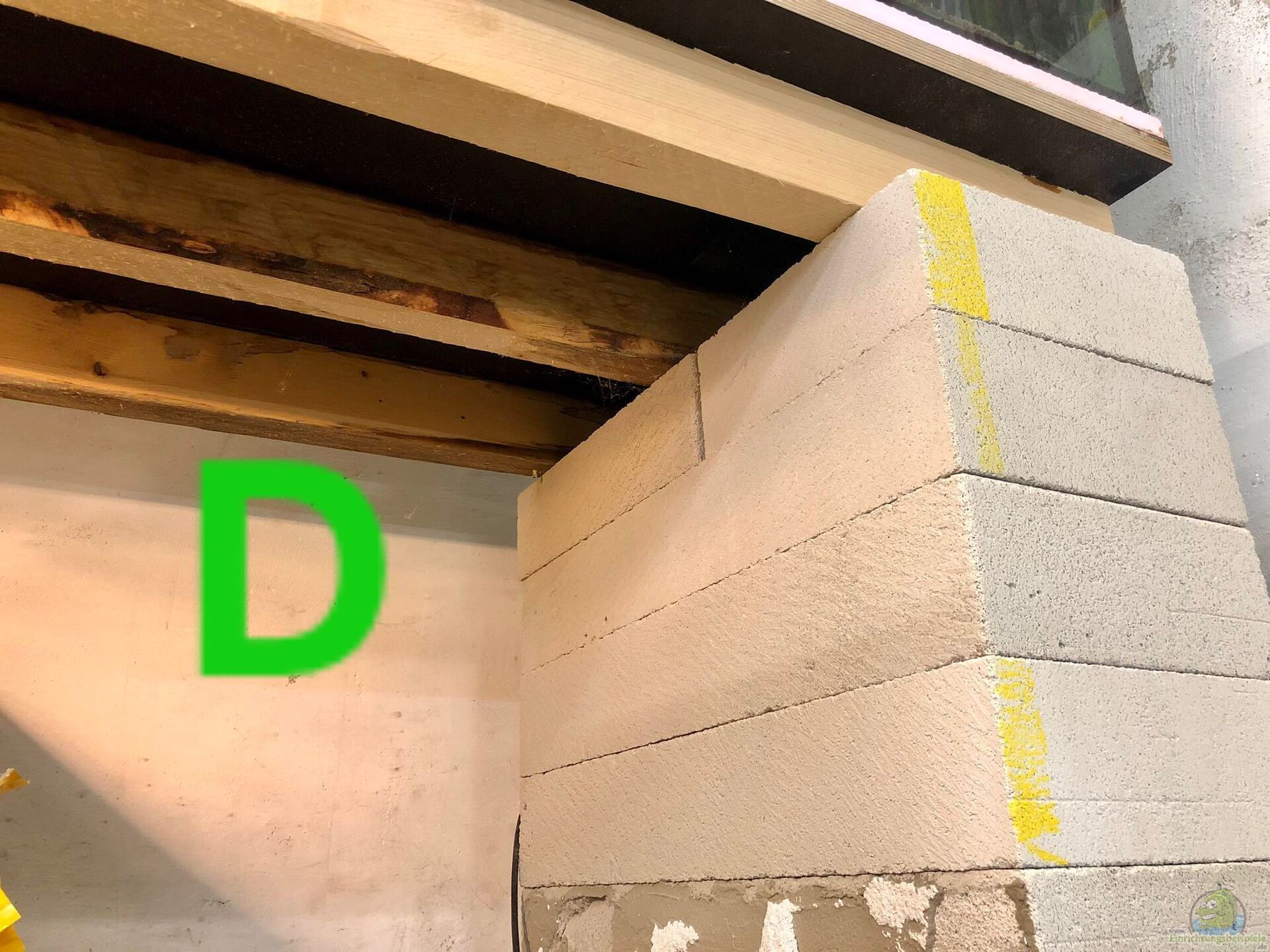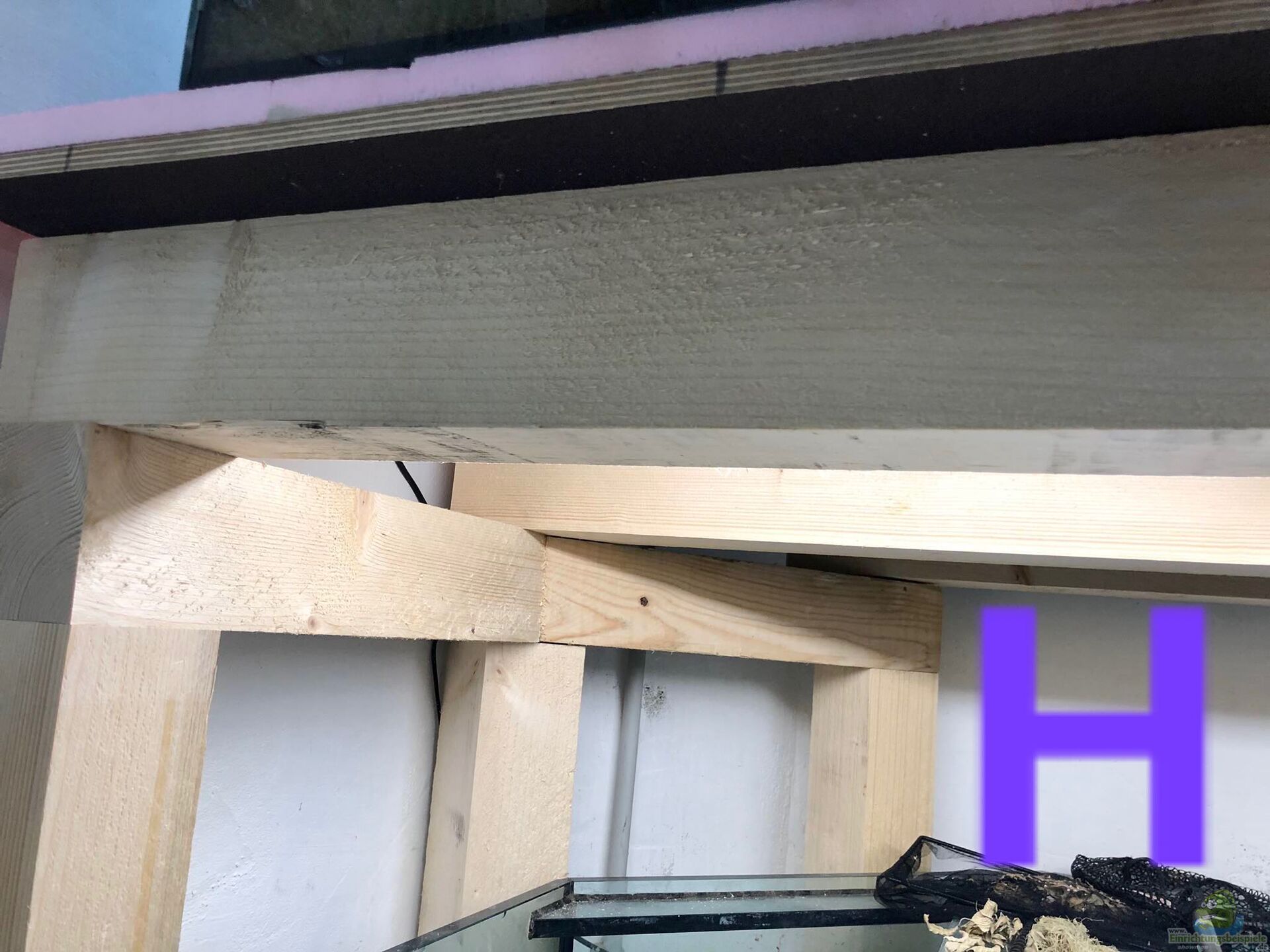 Ich wollte schon immer mal Becken auf Ytong Ziegel (Bilder mit D) stehen haben und für unsere beiden Becken mit über 500 Liter haben wir deshalb diese Ziegel verwendet. Wir haben unter den Becken drei Vierkant-Hölzer aus Fichte mit 8x5cm Hochkant gelegt und darauf kam die 21mm Siebdruckplatte. Hochkant liegen sie deshalb, da sie dann mehr Last halten.