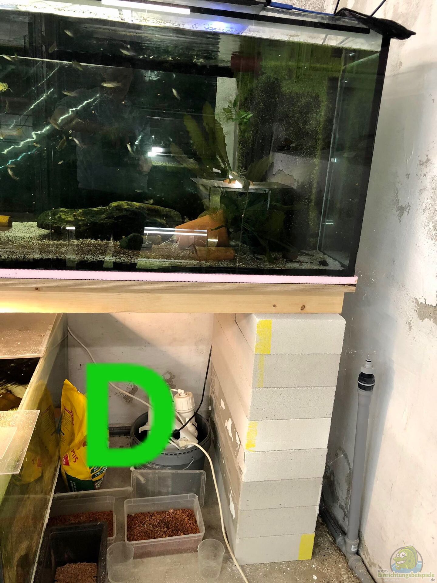 Alois ist mit dieser Lösung so zufrieden, sodass wir nun auch bei den beiden über 500 Liter fassenden Becken diese Variante anwenden werden, um so noch mehr Becken in unserem Keller unterzubringen. Dann werden die Ytong-Ziegel weichen und es ist noch ein Regal von den Orange-Blauen möglich (mit A gekennzeichnet).