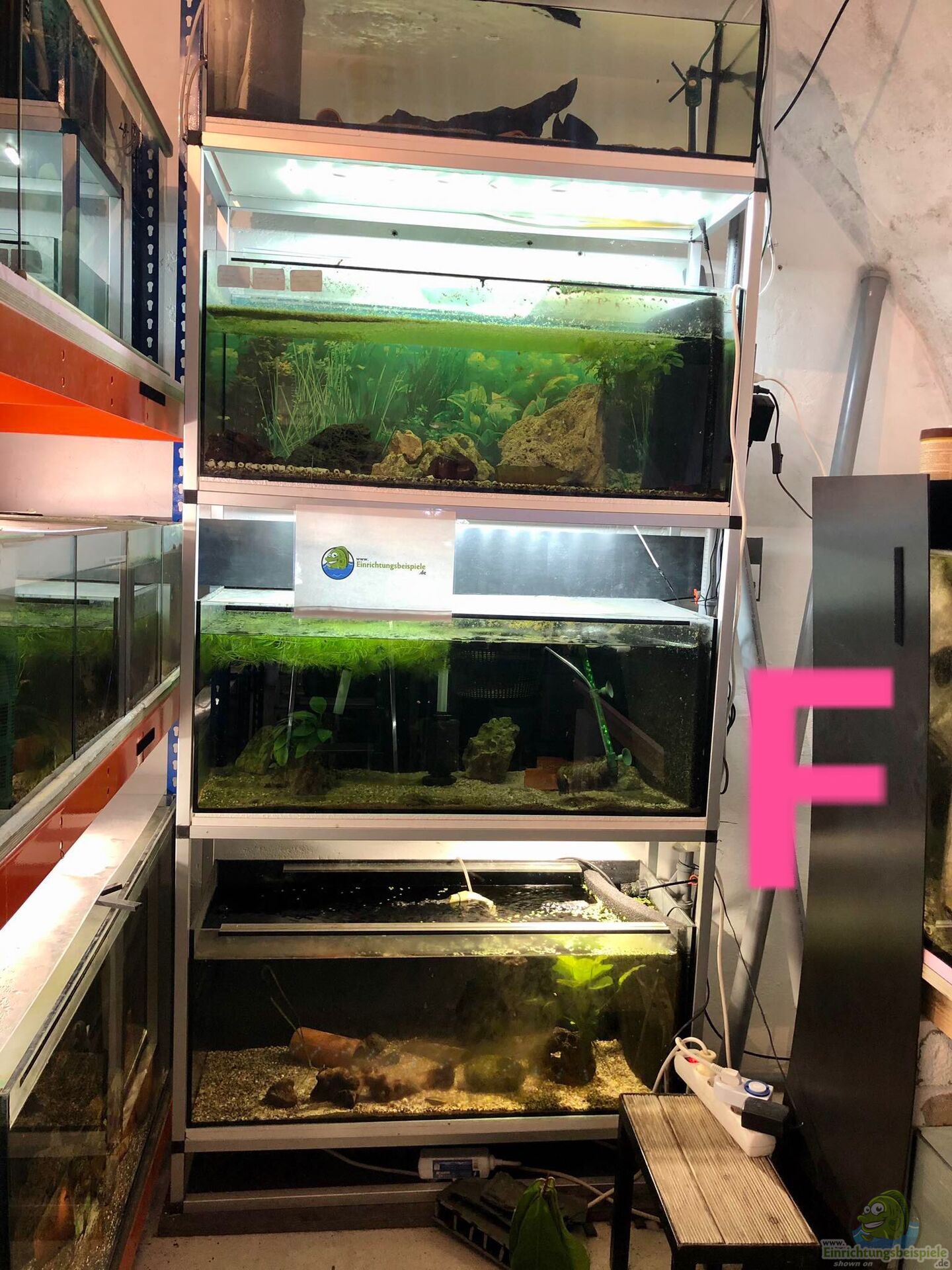 Auch ein Alu-Regal (Alu-Steck-System) haben wir von einem Vereinskollegen übernommen (Bilder mit F gekennzeichnet). Bei diesem System findet pro Etage von vier Etagen jeweils ein Becken mit 100x40x40cm Platz. Dieses System ist Platzsparend und vor allem für kleinere Becken sehr gut geeignet. Allerdings müssen wir unser Regal noch an der Wand befestigen ??? aus Sicherheitsgründen, da ansonsten das Regal auf einen zukommen könnte, wenn man sich daran festhält. Es ist also nicht unbedingt so standfest, wie die anderen Regale.