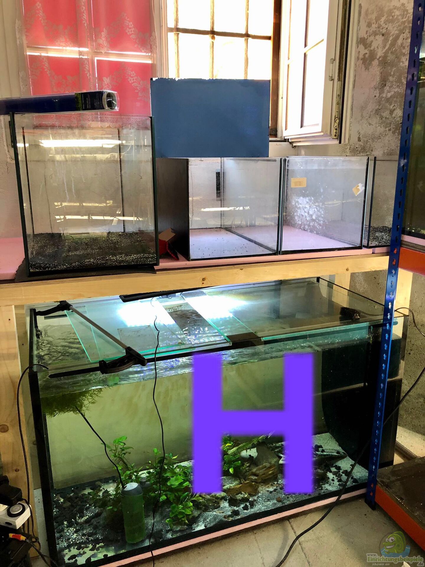 Auf den Bildern (mit B gekennzeichnet) sieht man links ein 430 Liter Becken und rechts ein 120 Liter Becken. Diese beiden Becken stehen seit dem letzten Jahr (Herbst 2019) auf diesem Regal. Auf die untere Etage sollen dieselben Becken kommen (das 430 Liter Becken fehlt uns dzt. noch).