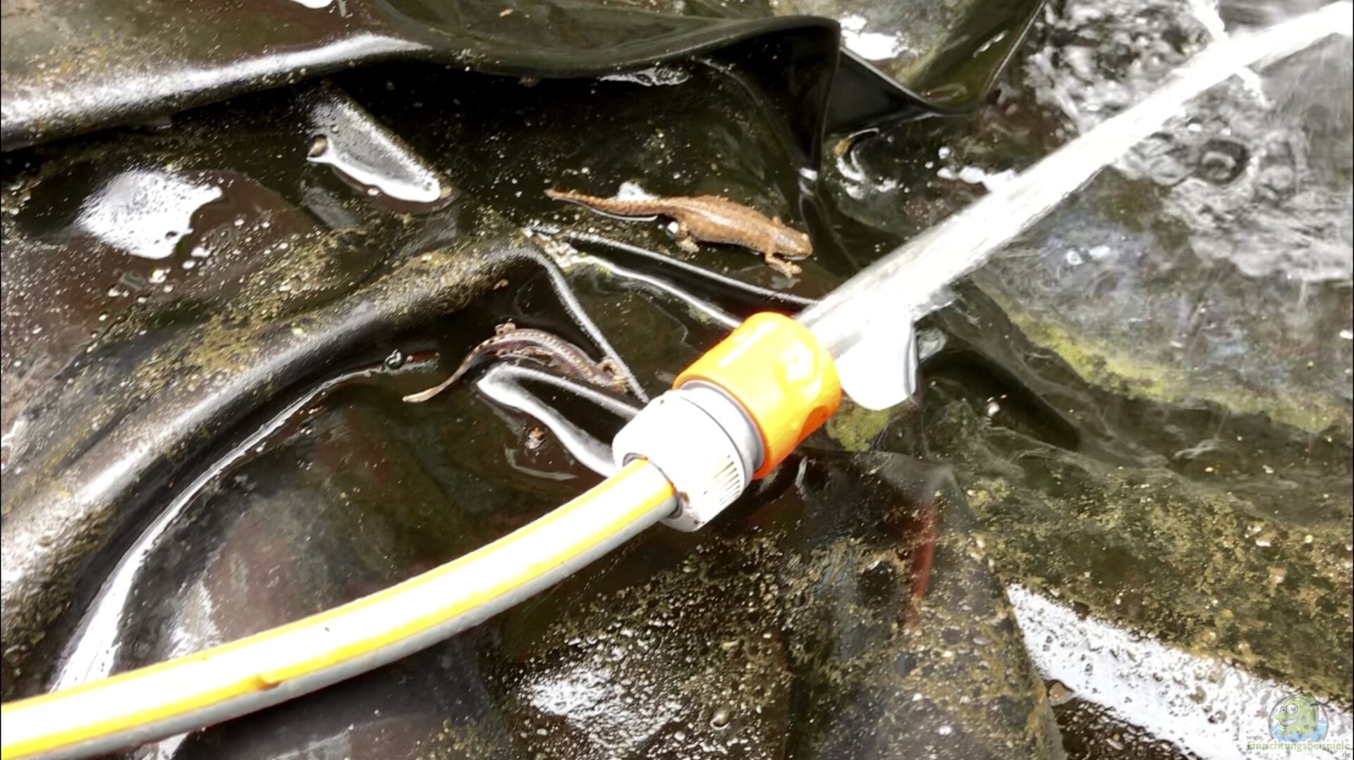 Anschlie??end wird der Teich wieder mit Wasser befüllt und die Tiere sogleich zurückgelassen. Diese Reinigung läuft nun schon seit vielen Jahren und bisher wohl immer erfolgreich, da über die Jahre mehr Molche, als früher im Teich sind. Anfangs freuten wir uns noch über 4-6 Zufalls-Fänge und heuer waren es mindestens acht Tiere. Letztes Jahr gab es mit einem Zufalls-Fang von 11-12 Tieren allerdings einen Rekord.