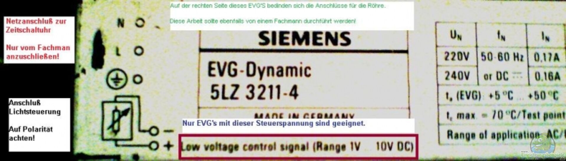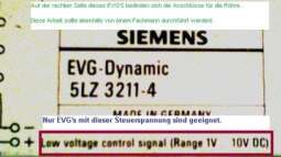 Das EVG muss über einen Steuerausgang von 1 bis 10 Volt verfügen (zwei zusätzliche Klemmen am EVG mit Bezeichnung + und ??? sowie einem Potentiometersymbol [Rechteck mit darin schräg liegendem Pfeil])