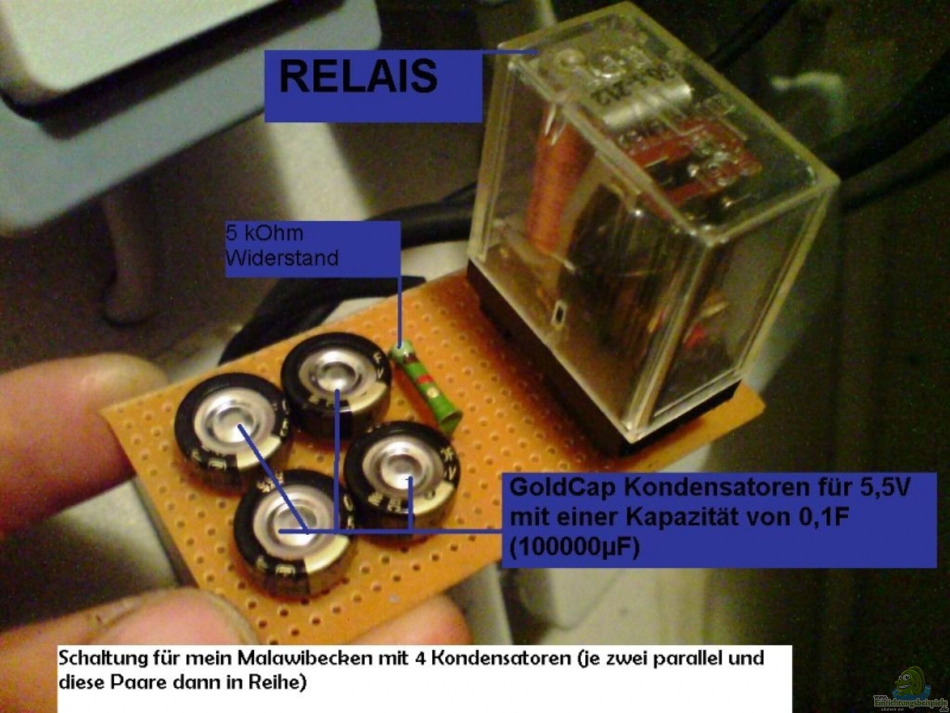 In Reihenschaltungen wird mit zunehmender Anzahl an Kondensatoren die Gesamtkapazität kleiner. In Parallelschaltungen addieren sich die Einzelkapazitäten, allerdings bleibt die Spannung bei 5, 5V. Daher muss man eine Mischung aus Reihen und Parallelschaltung nehmen. Zwei Paare parallel geschalteter Kondensatoren werden in Reihe geklemmt. So erhäht man aus 4 Kondensatoren, die für 5, 5V ausgelegt sind und eine Einzelkapazität von 0, 1F aufweisen, eine Gesamtkapazität von 0, 1F, die 11V aushält (zwei 0, 1F in Reihe = 0, 05 F; zwei 0, 05 parallel = 0, 1F).