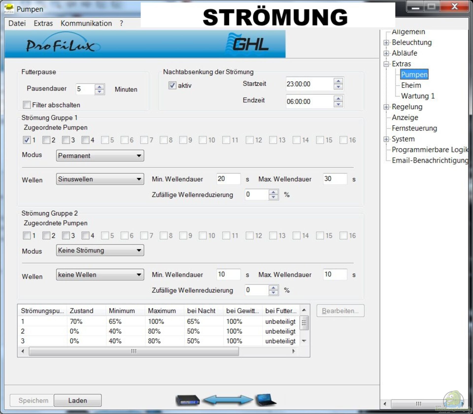 Tagsüber, also während der Hauptbeleuchtungszeiten, läuft die Pumpe in 30 Sekunden Wellen von 65 auf 100%. Das hei??t nicht, dass die Pumpe Wellen an der Wasseroberfläche erzeugt, sondern dass einfach die Strömungsstärke permanent zu- bzw. abnimmt. Schutz wird auf diese Weise besser weggespült, Pflanzen und Fische bewegen oder schwimmen schöner in der Strömung. Das sind aber ganz klar subjektive Eindrücke meinerseits.