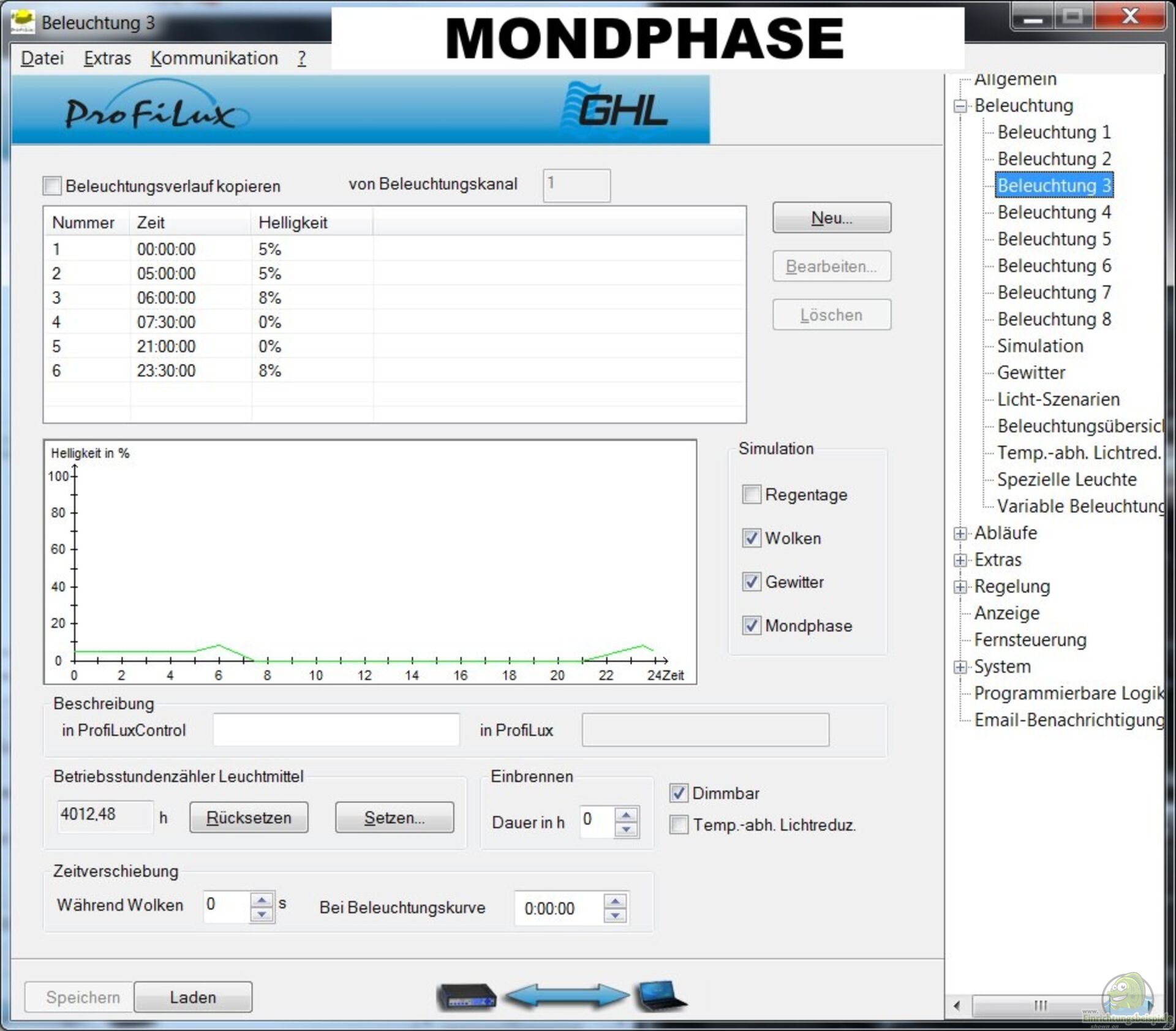 Der ursprünglich ausschlaggebende Punkt, dass ich mir einen Computer angeschafft habe, war der Wunsch meine Beleuchtung dimmbar zu gestalten. Das Licht sollte morgens nicht mit einem Schlag mit 100% Leuchtkraft einschalten - ein Sonnenaufgang musste her! Bis zum Mittag erhöht sich nun nur allmählich die Lichtstärke, um sich dann ab dem frühen Nachmittag wieder zu verringern. Am späten Abend beträgt die Intensität gegen 23:00 Uhr nur noch 1% und der ??bergang zum Mondlicht ist beinahe flie??end.