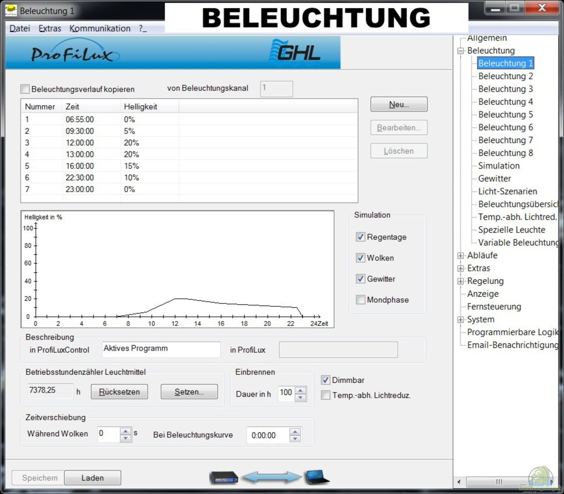 Eine zusätzliche Möglichkeit die Beleuchtung abwechslungsreicher, interessanter oder auch natürlicher zu gestalten ist die Wolkensimulation: Man gibt an wie oft und wie stark sich der "Himmel" verdunkeln soll und der Computer lässt per Zufall ab und zu eine Wolke über das Aquarium hinweg ziehen. Dabei wird das Licht langsam um den eingegebenen Wert abgeschwächt und wieder aufgehellt. Ich schätze diese Funktion mittlerweile sehr, da es sehr viel Natürlichkeit mit sich bringt und die Monotonie beseitigt.