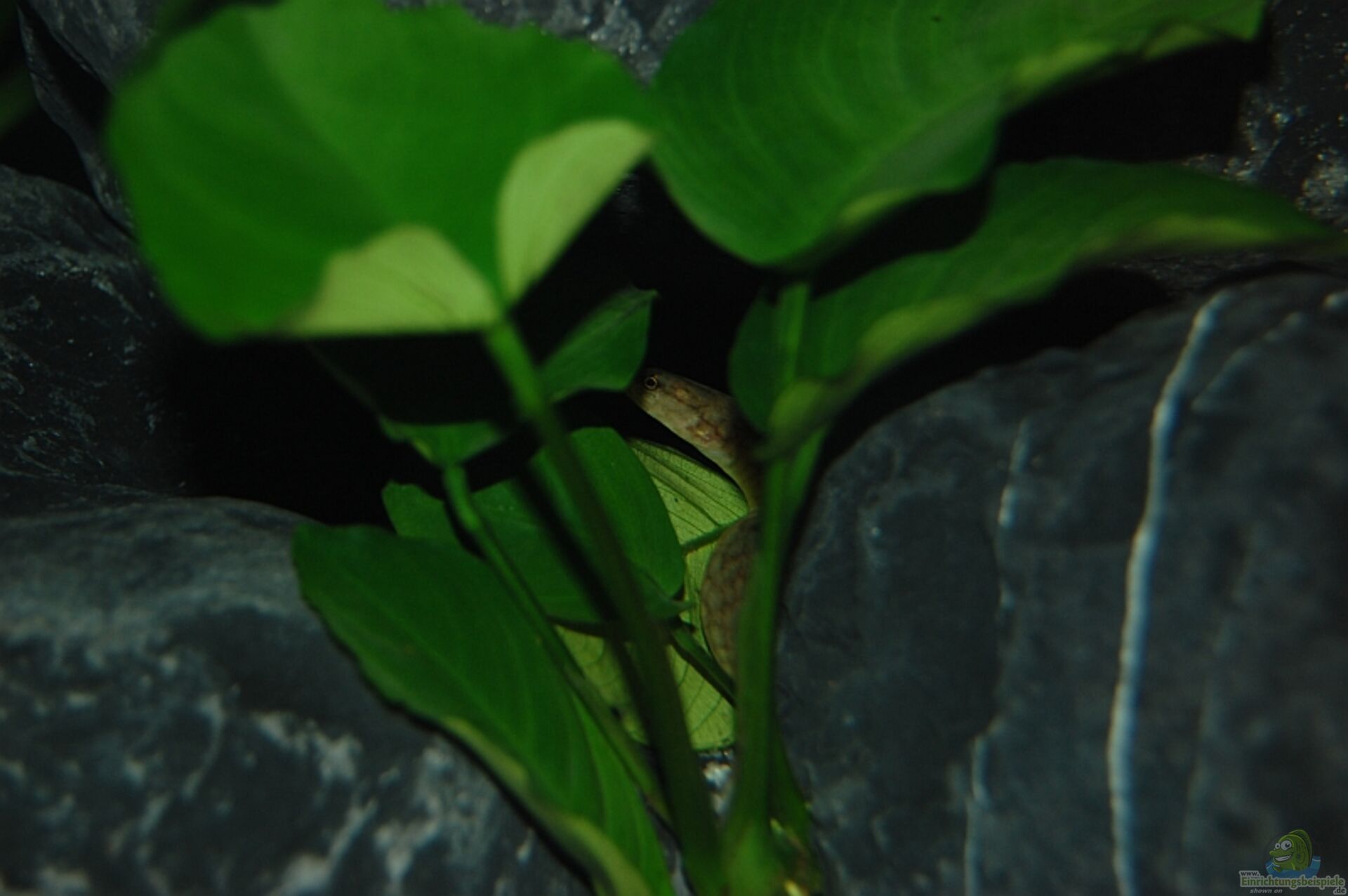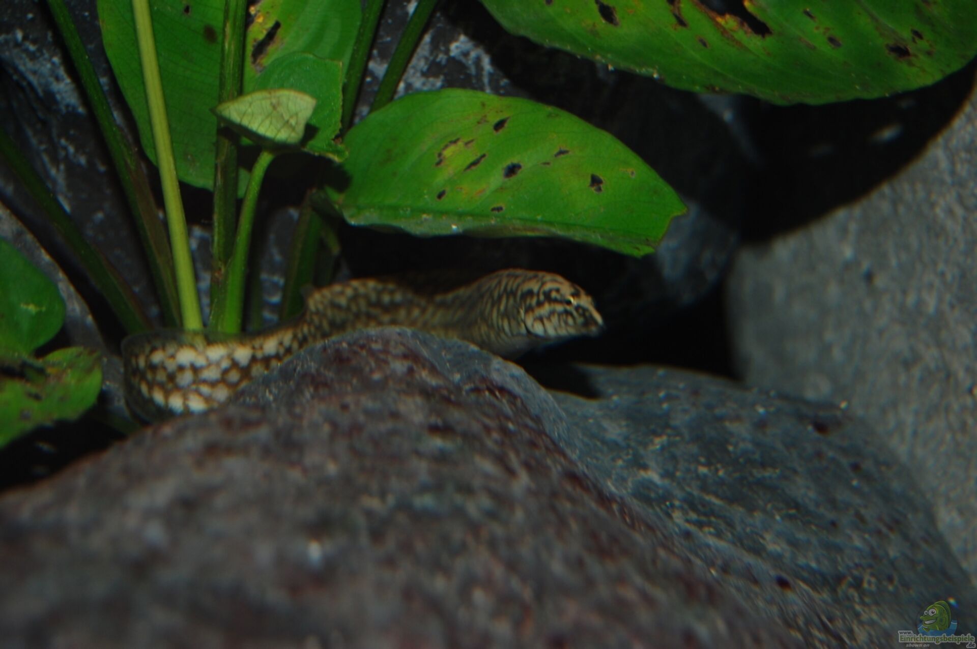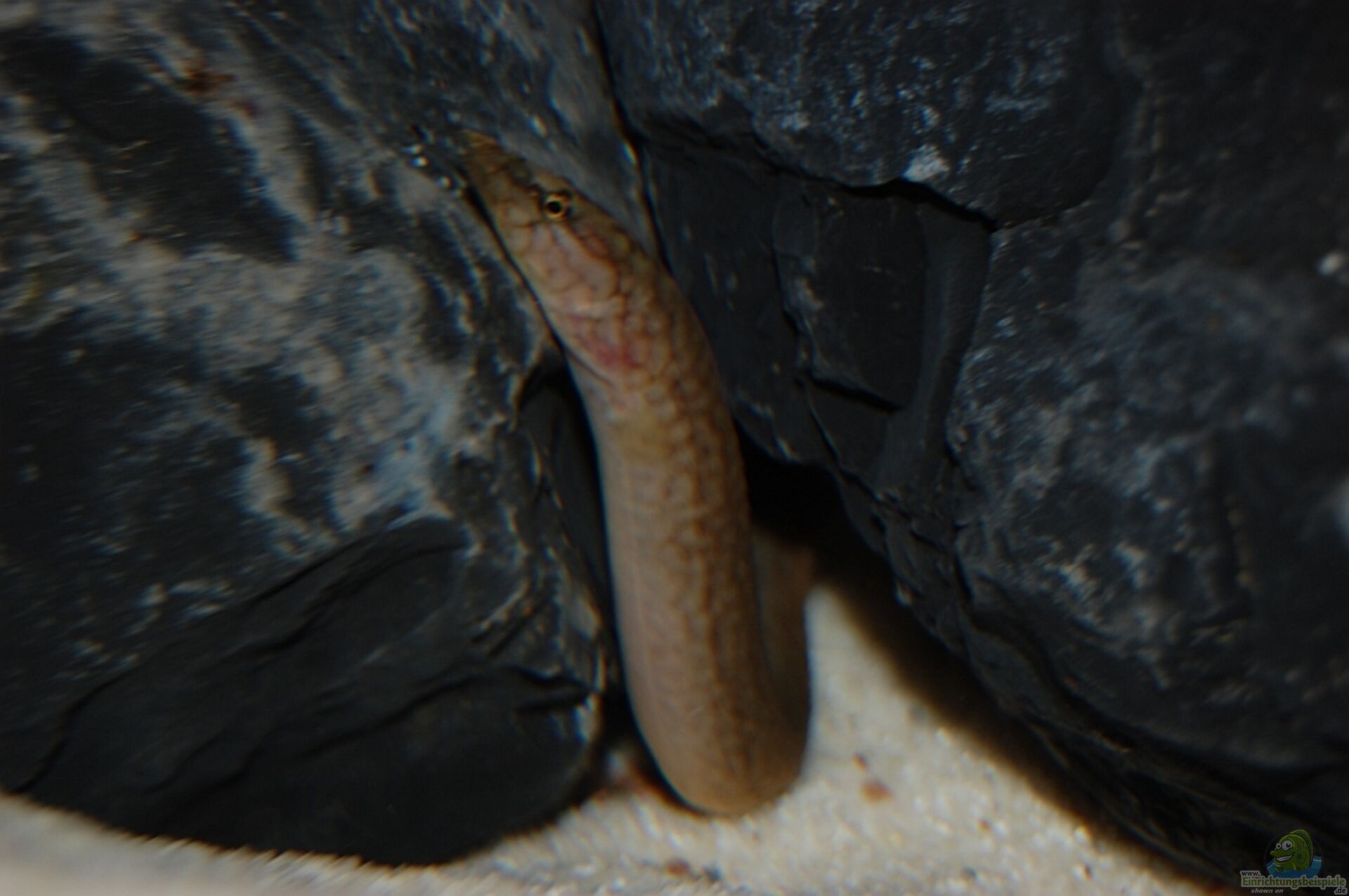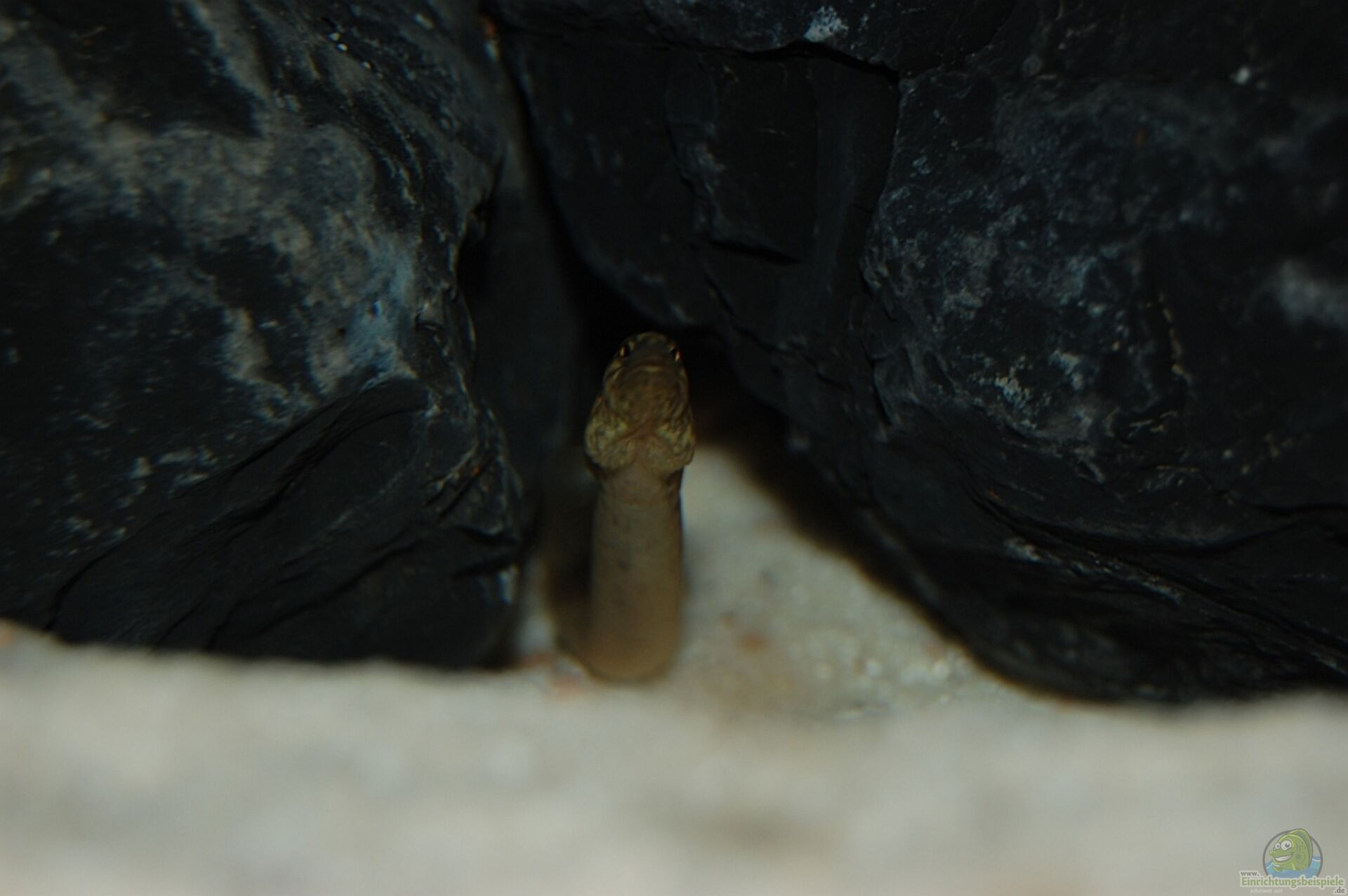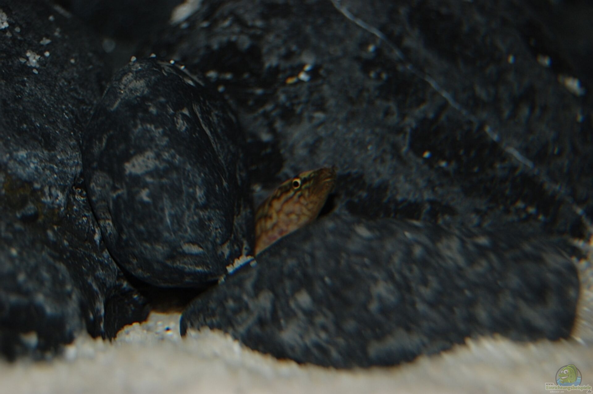 Wie sie dann so aus ihrem Versteck heraus gucken, erinnert das stark an eine Muräne wie ich finde. Meine Kiesel, die ich erst vor ein paar Tagen ins Becken getan habe, erweisen sich als super Versteck. Ich hätte gar nicht gedacht dass die Aale darunter/dazwischen passen, funktioniert aber bestens und wurde direkt angenommen.