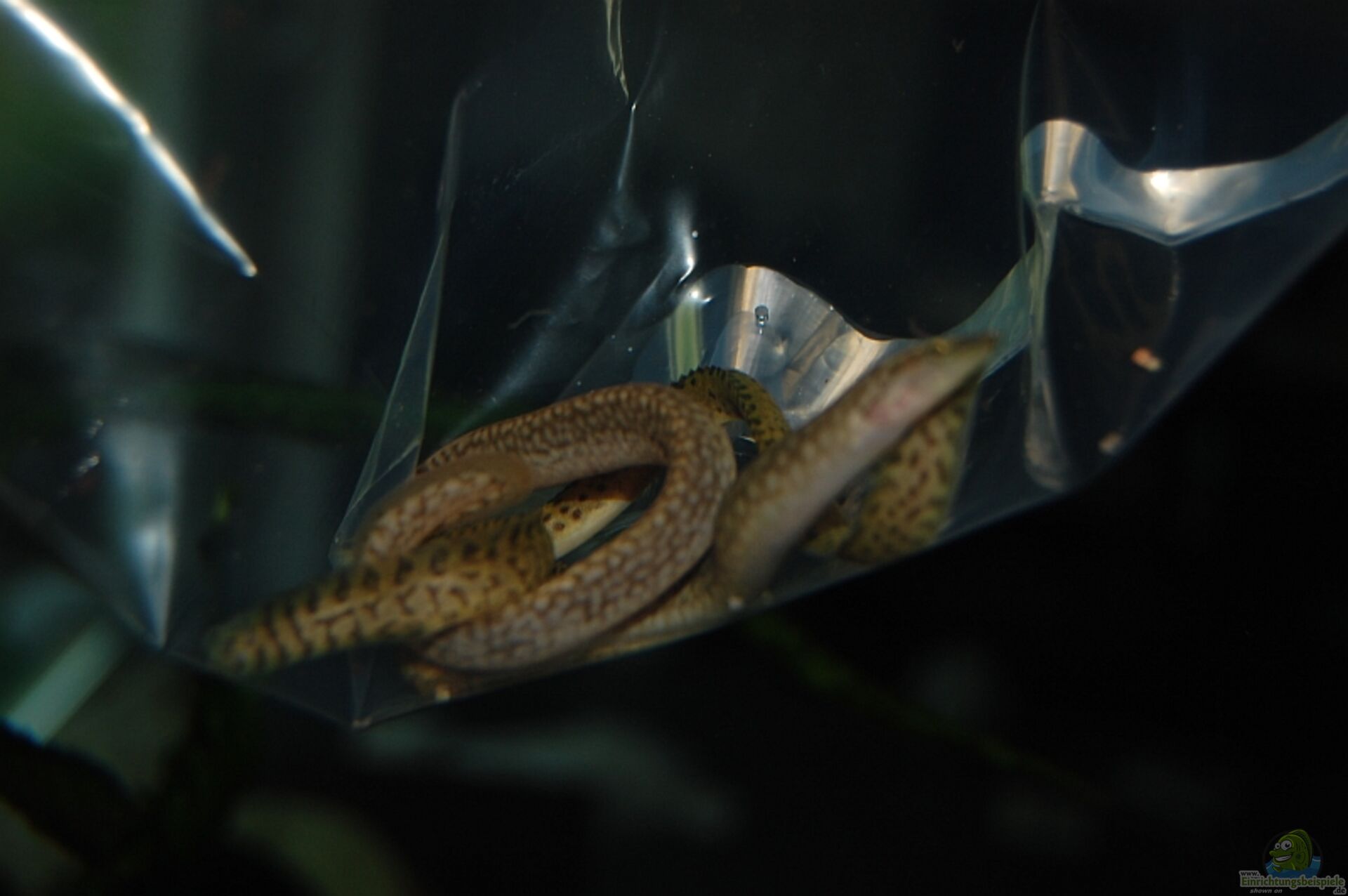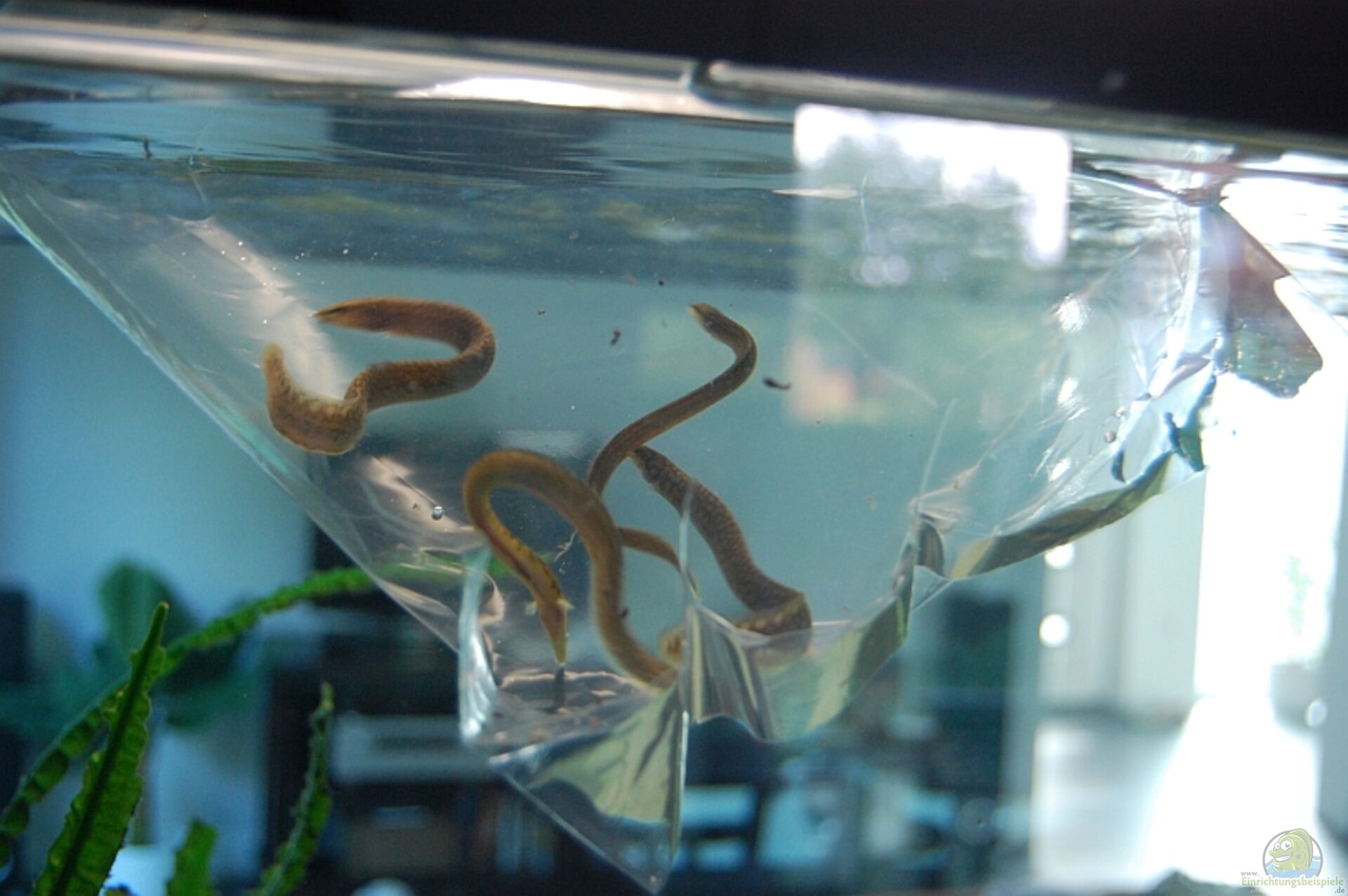 Gestern waren auch erstmals 2 Aale gleichzeitig in der Flasche. Insgesamt habe ich gestern 3 Tiere sehen können. Sie leben schon recht versteckt und zeigen sich meist nur zu den festen Futterzeiten bereitwillig. Aber wo 3 sind werden auch 4 sein. Es ist eben problematisch die Tiere auseinander zuhalten da man sie selten in vollem Umfang sieht, und eine Unterscheidung lediglich am Kopf schier unmöglich ist.