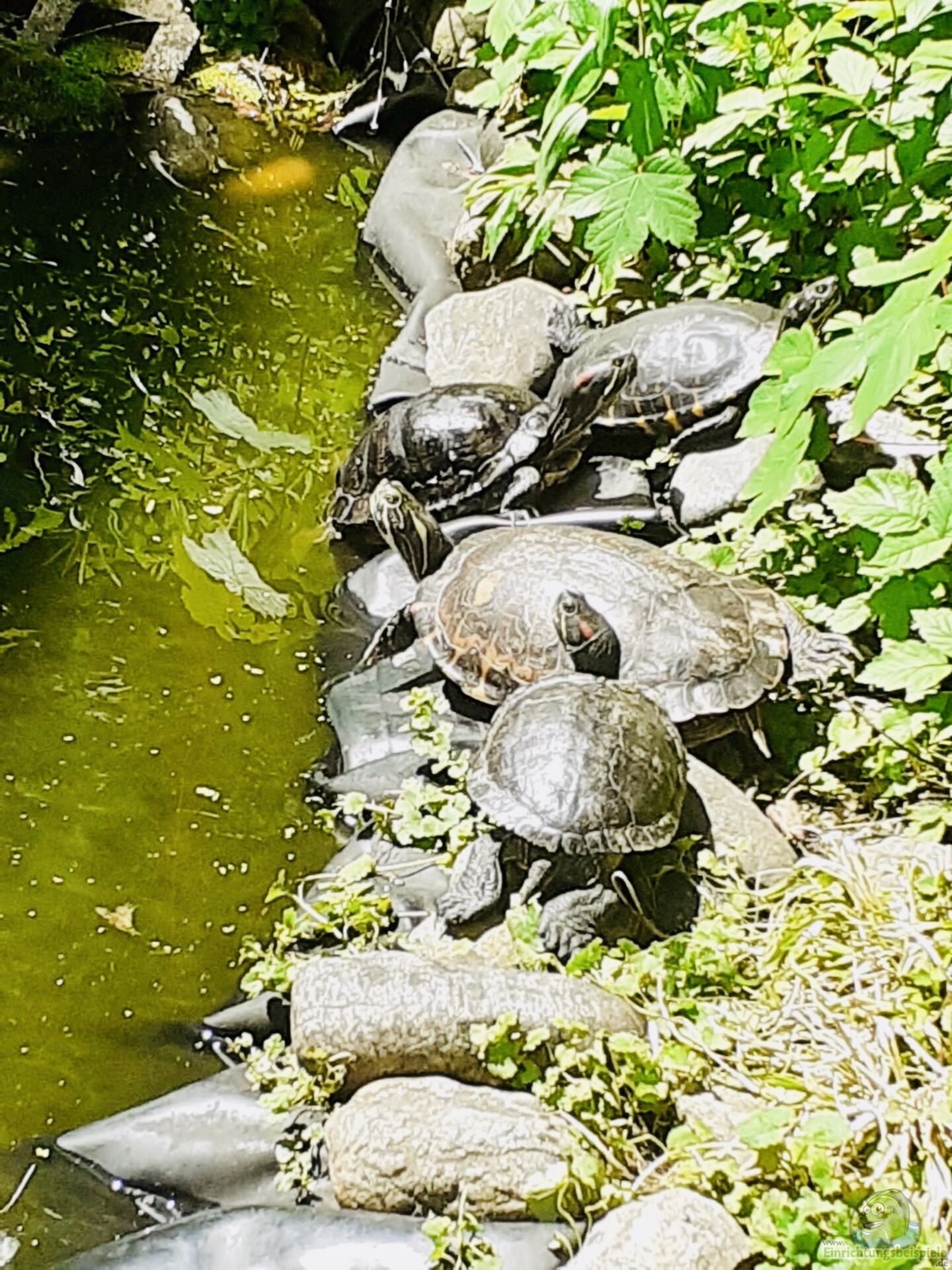 Ein Foto zeigt meinen Liebling Morla ??? diese Aufnahme entstand jedoch im Sommer vor drei oder vier Jahren. Und das Gruppen-Bild entstand ca.einer Woche nach dem Start in die Teich-Saison 2020. Unter Sonnenlicht verlieren die Tiere jedes Jahr zu Beginn der Teich-Saison vermehrt Panzerschuppen.