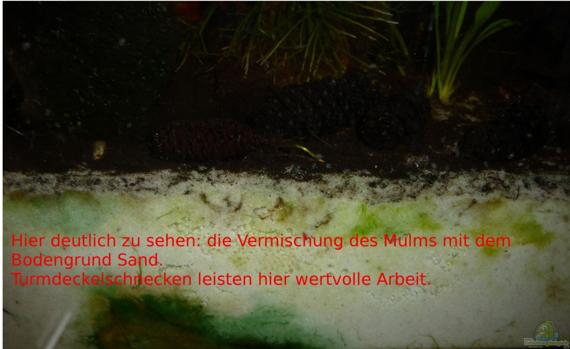 Es sei darauf hingewiesen, dass sich die folgenden Ausführungen auf die Mulmansammlung im Becken mit Sand als Bodengrund beschäftigen. Wie auch in dem vorangehenden Kapitel schon erwähnt, ist Kies eine andere Beckenstruktur und für eine Mulmansammlung nicht geeignet. (Vgl. auch die Bemerkung Nikolai Mette auf www.fischtante.wordpress.com, als Kommentar zum Blogartikel, hier: N.M., genannt, Comment am 27. Januar 2009, letzter Zugriff am 26. Jan. 2013): ???Weiterhin bin ich inzwischen der ??berzeugung, da?? vermulmte Aquarien nur in Kombination mit Sandboden sinnvoll sind; bei Kies sinkt zuviel zwischen die Zwischenräume; so etwas gibt es auch natürlicherweise nicht (Kies -> Strömung, kein Mulm).???