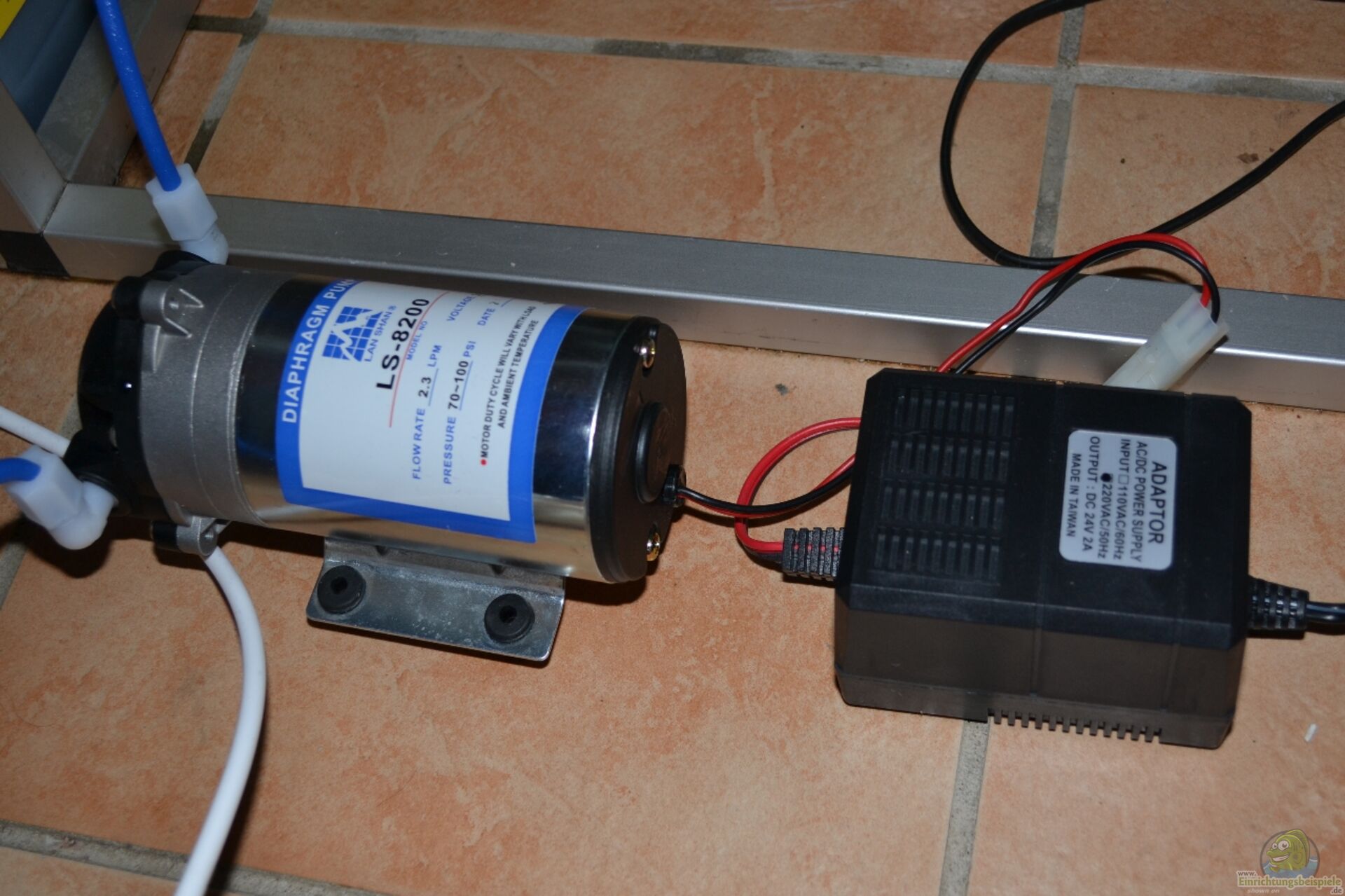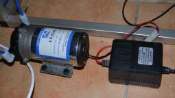 Fotos 14-16: Die neue Osmoseanlage (mit GPD180-Membran) mit Spülventil zum Rückspülen der Membran, Druckerhöhungspumpe, 24V-Netzteil und TDS-Inlinetester für das Ein- und Ausgangswasser. Die Anlage erzeugt bis zu 720l Osmosewasser (Permeat) am Tag.