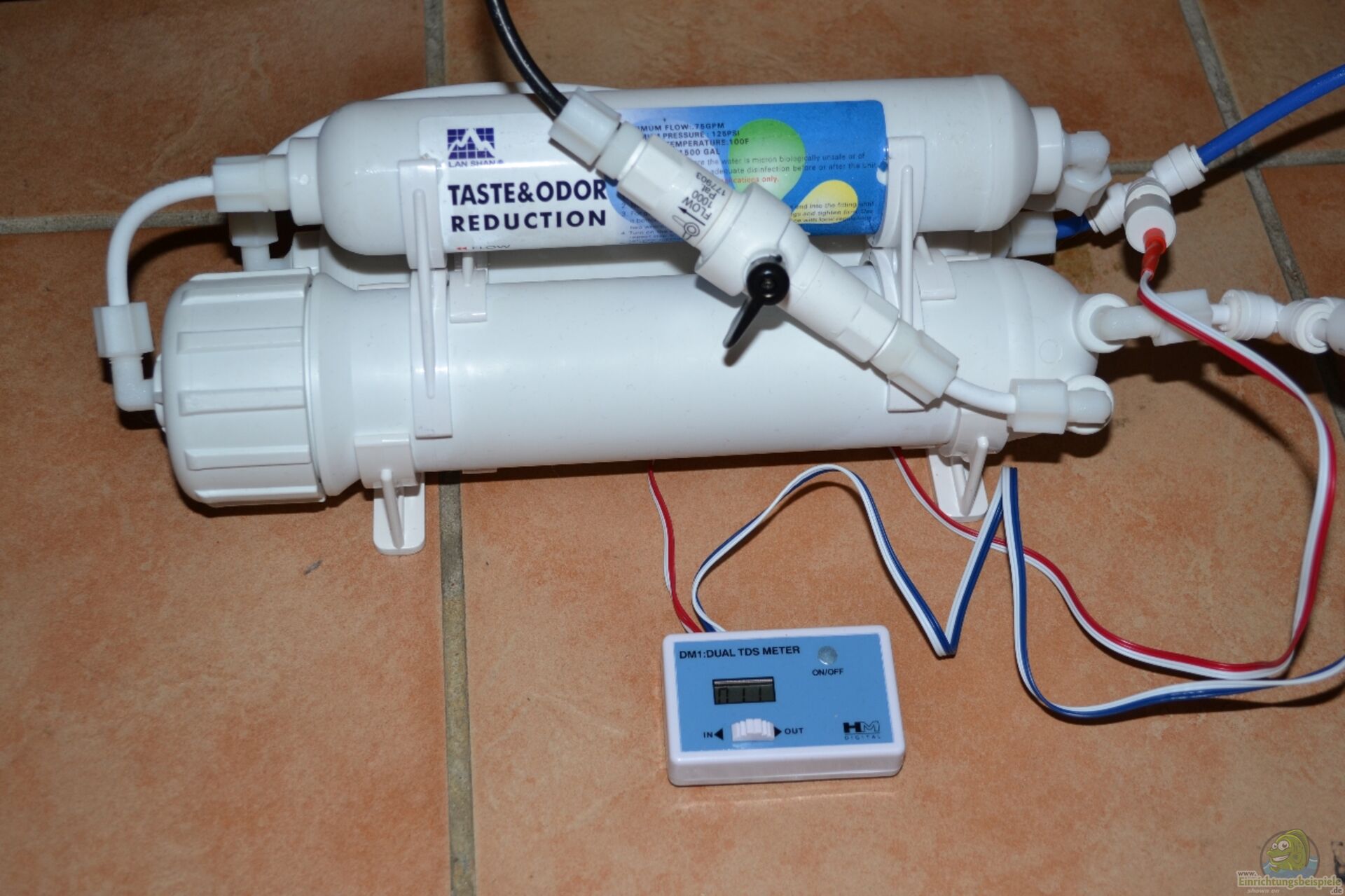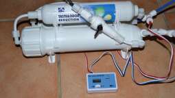 2.) Festeinbau der neuen Osmose mit 700l/d, mit Druckerhöhungspumpe und TDS-Inline-Messgerät für Ein- und Ausgangswasser (siehe Fotos unten). Zus. wird hier ein Steuerventil für den autom. Wasserwechsel gesetzt in Verbindung mit dem pH-Wert- und der Leitwertmessung des GHL Profilux Plus II ex.