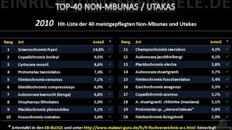 In allen Malawi-Becken, welche im Laufe des Jahres 2010 auf Einrichtungsbeispiele.de aktualisiert worden sind, werden genau 134 verschiedene Arten von Malawi-Buntbarschen gepflegt. Genauer gesagt, 74 verschiedene Non-Mbunas und Utakas und 60 Mbuna-Arten.