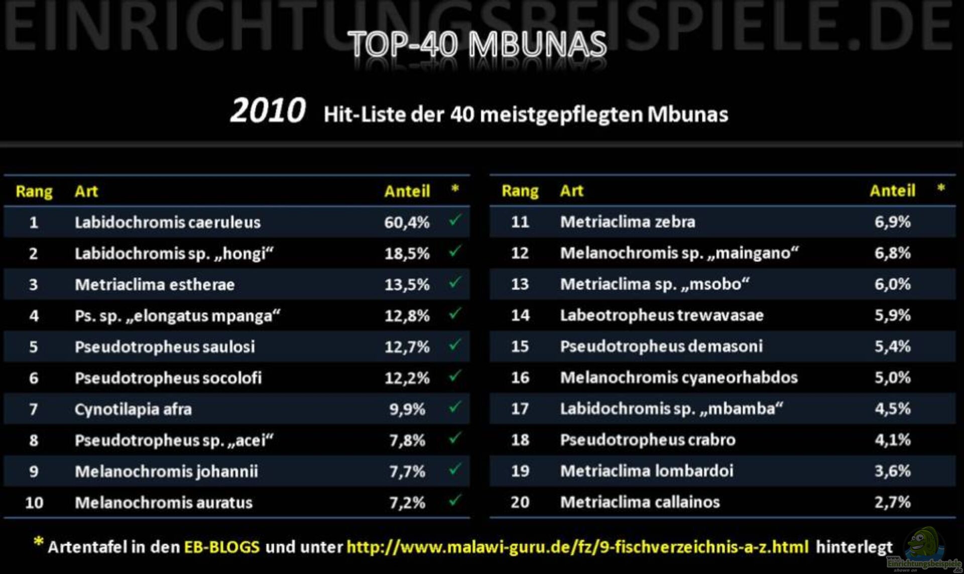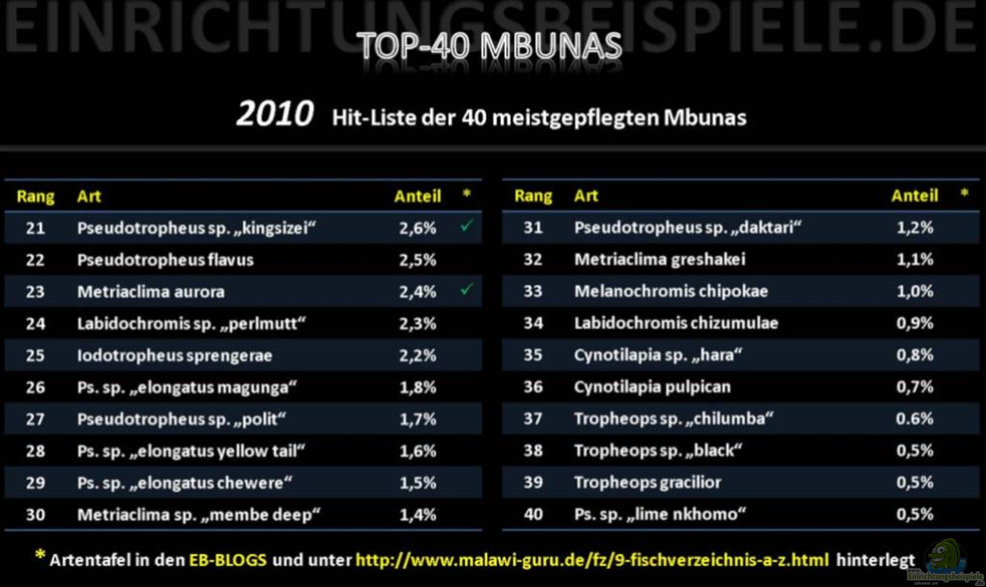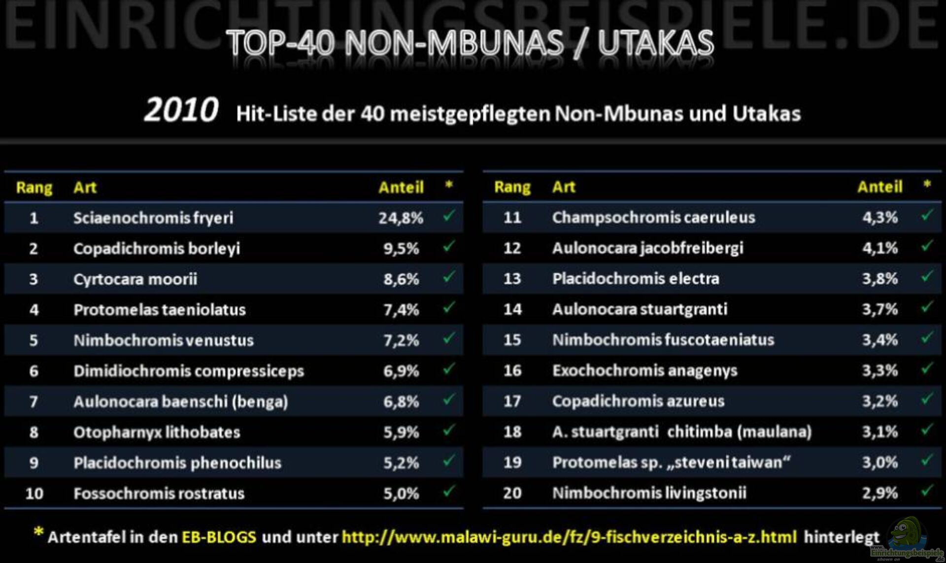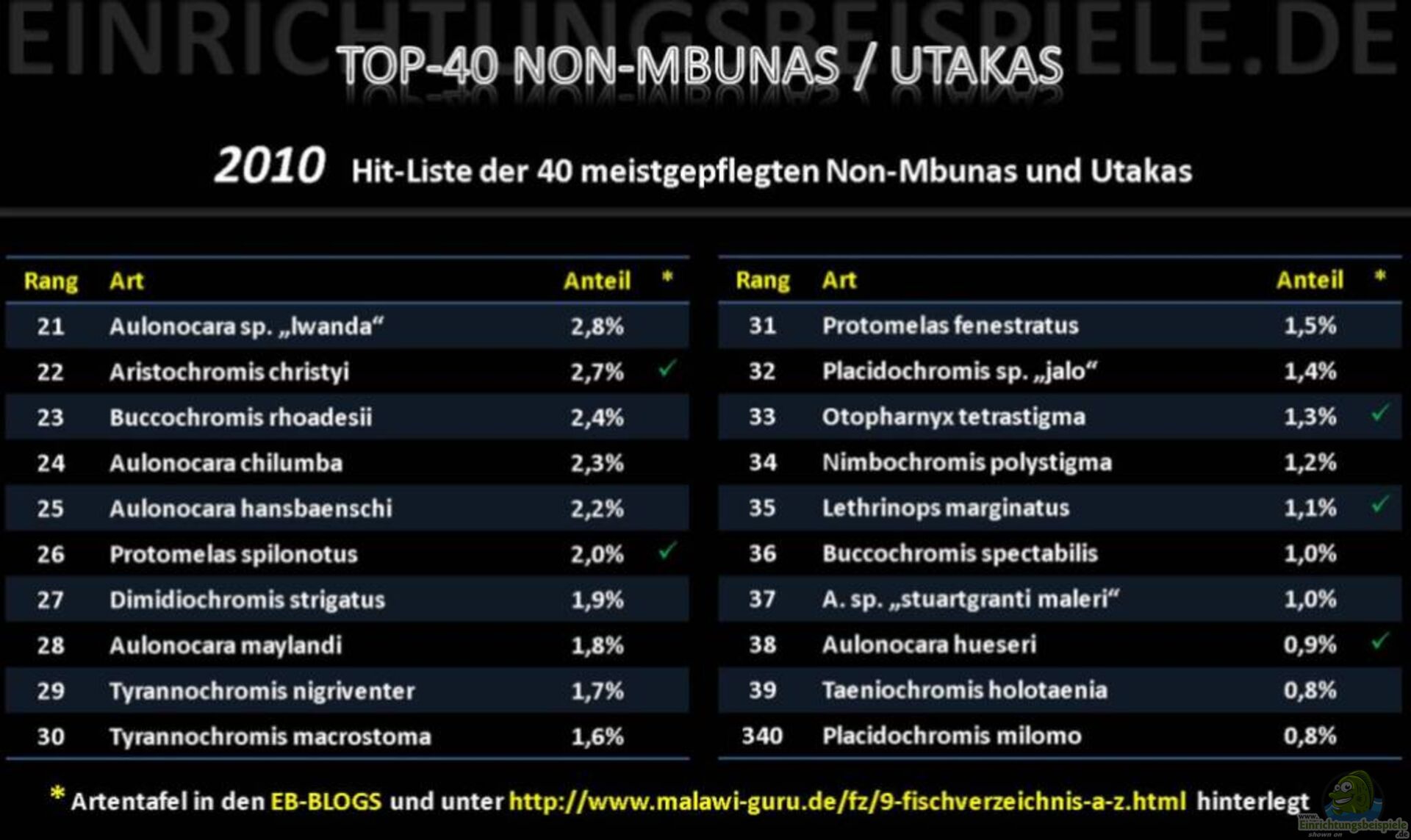 Die Top-40-Tafeln sind nun neu mit einer Spalte versehen, welche darauf hinweist, ob die entsprechende Art bereits als Artentafel in einem EB-BLOG oder auf www.malawi-guru.de ersichtlich ist.