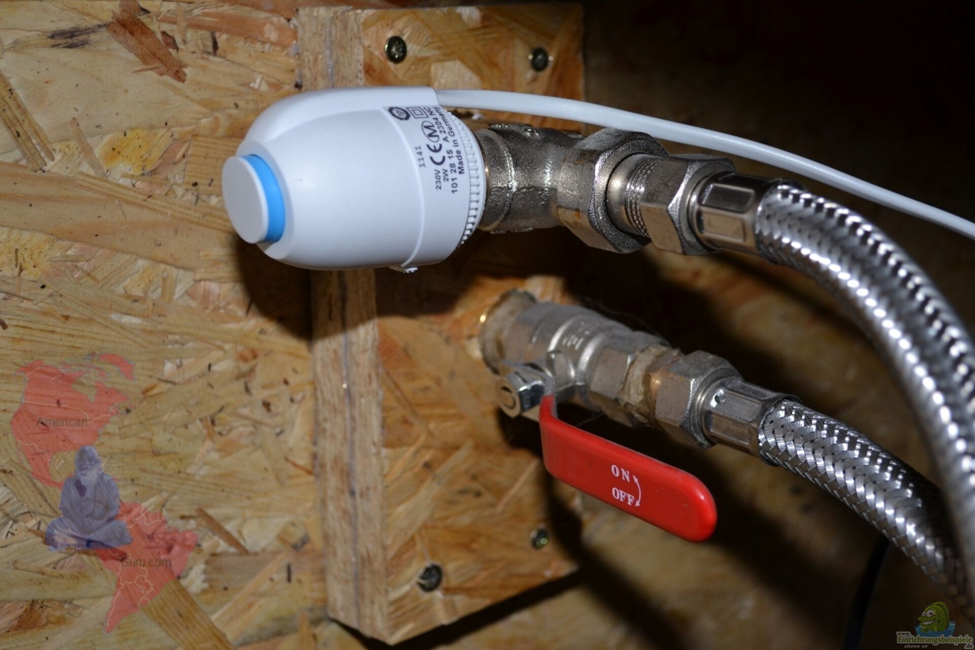 Bild 4: Der mechanische Regler wurde gegen einen Stellmotor (230V) ausgetauscht der direkt mit dem elek. Thermostaten verbunden ist. Damit sind jetzt auch höhere Temperaturen möglich. Wenn die Spannung weg ist fährt er wieder automatisch zu.