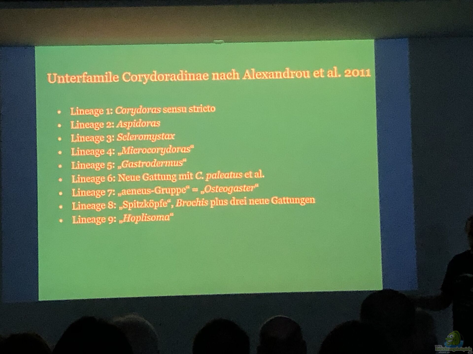 Pünktlich um 9.30h begann die Veranstaltung mit Begrü??ung und um 10:00h fand der erste Vortrag von Hans Georg Evers ???Auf der Suche nach seltenen Panzerwelsen??? statt. Ich selbst kenne mich bei Panzerwelsen nur oberflächlich aus aber der Vortrag war sehr interessant und gab einen tollen Einblick in diesen Artenreichtum bei den Corydoras. Anerkannt sind nur drei Linien, doch es sollte eigentlich neun Linien geben. (Siehe Bild)