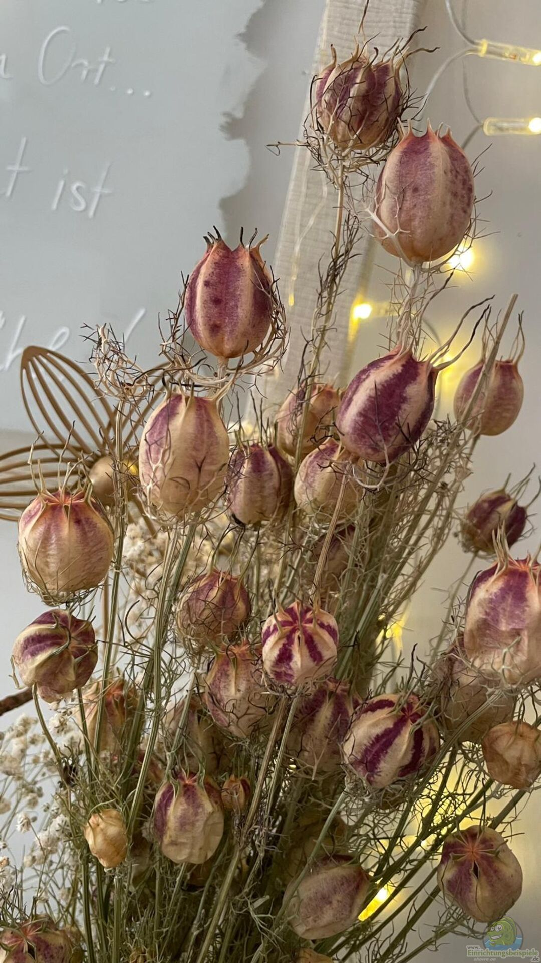 Ebenso beliebt ist die Jungfer im Grünen (Nigella damascena) mit ihren ballonartigen, durchscheinenden Samenkapseln, die sich hervorragend in Trockensträußen machen und auch einzeln in Schalen arrangiert werden können.