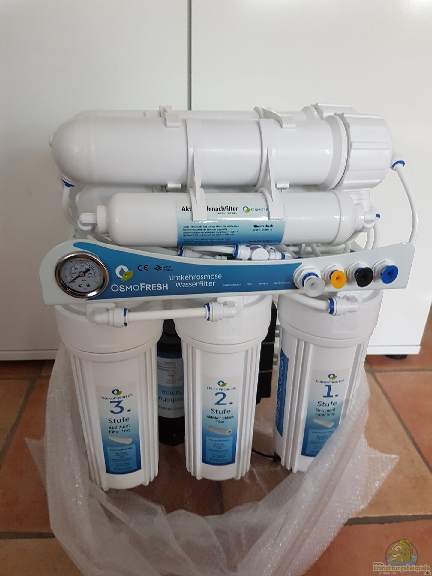 Ein typisches Umkehrosmose-System besteht aus mehreren Stufen der Filtration, einschließlich eines Sedimentfilters, eines Aktivkohlefilters, eines Kohleblockfilters und der Umkehrosmosemembran. Nach dem Durchlaufen des Filtersystems wird das Wasser in einem separaten Tank gespeichert.