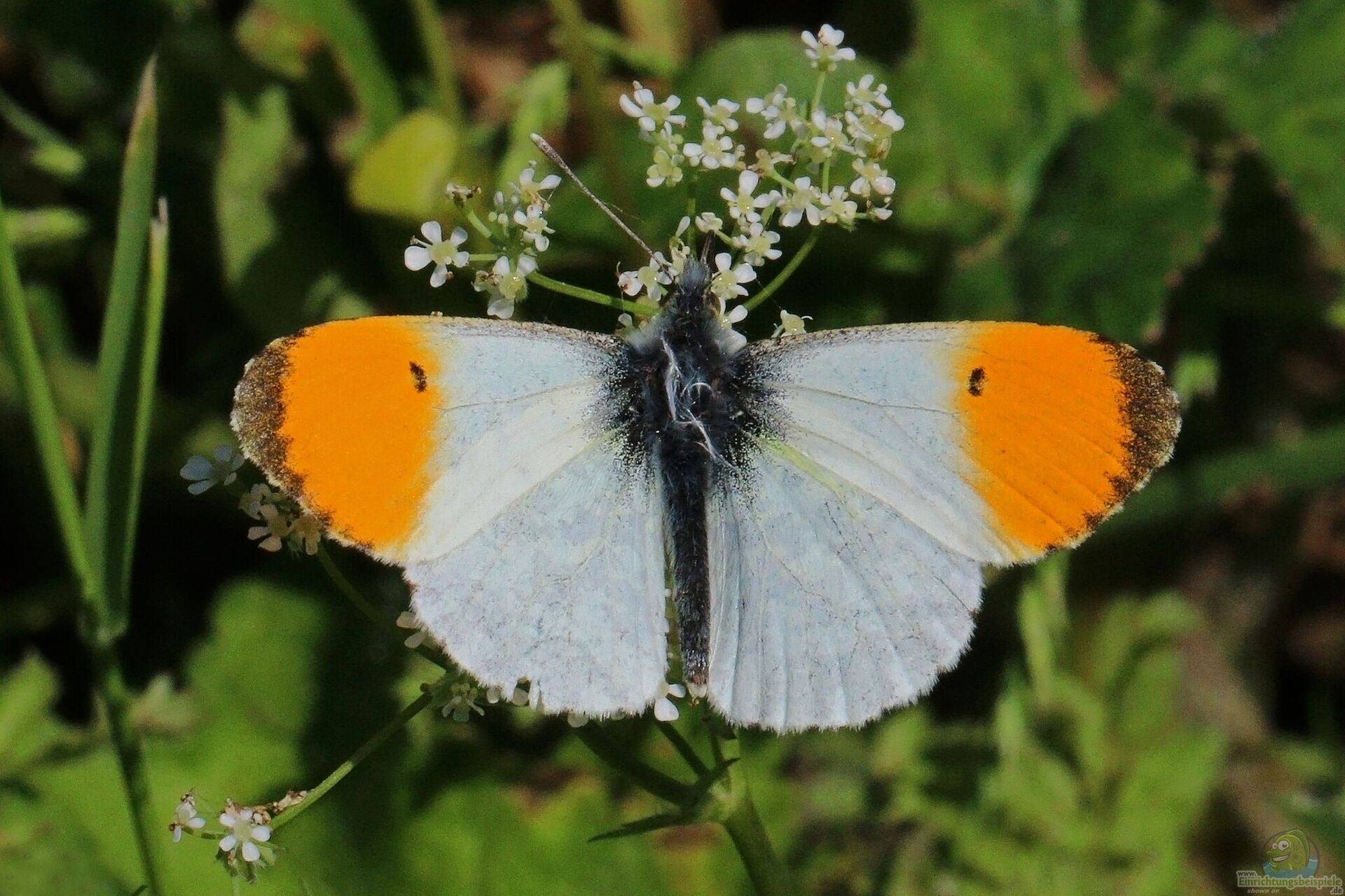- Aussehen: Weiß mit orangefarbenen Spitzen an den Vorderflügeln (bei Männchen); Weibchen sind reinweiß.