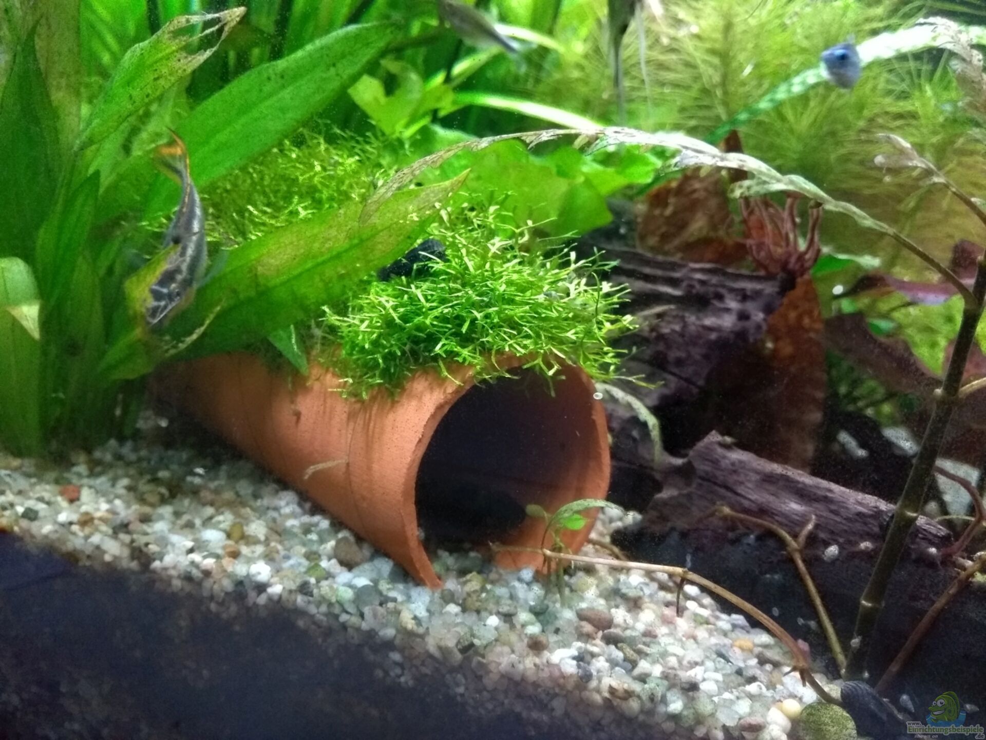 Pflanzen mit ausladenden Blättern, wie Anubias oder Farngewächse, können ebenfalls verwendet werden, um die Höhle zu überwachsen und so optisch verschwinden zu lassen.