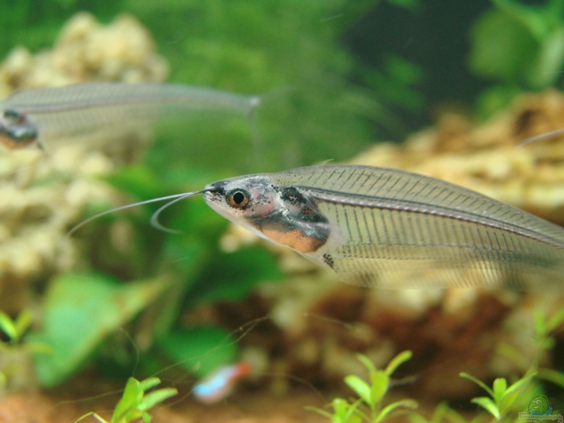 Aquariengestaltung: Ein gut strukturiertes Aquarium mit vielen Versteckmöglichkeiten und einer dichten Bepflanzung ahmt den natürlichen Lebensraum des Glaswelses nach und bietet ihm Sicherheit. Schwimmfreiraum sollte ebenfalls vorhanden sein, damit die Fische sich frei bewegen können.