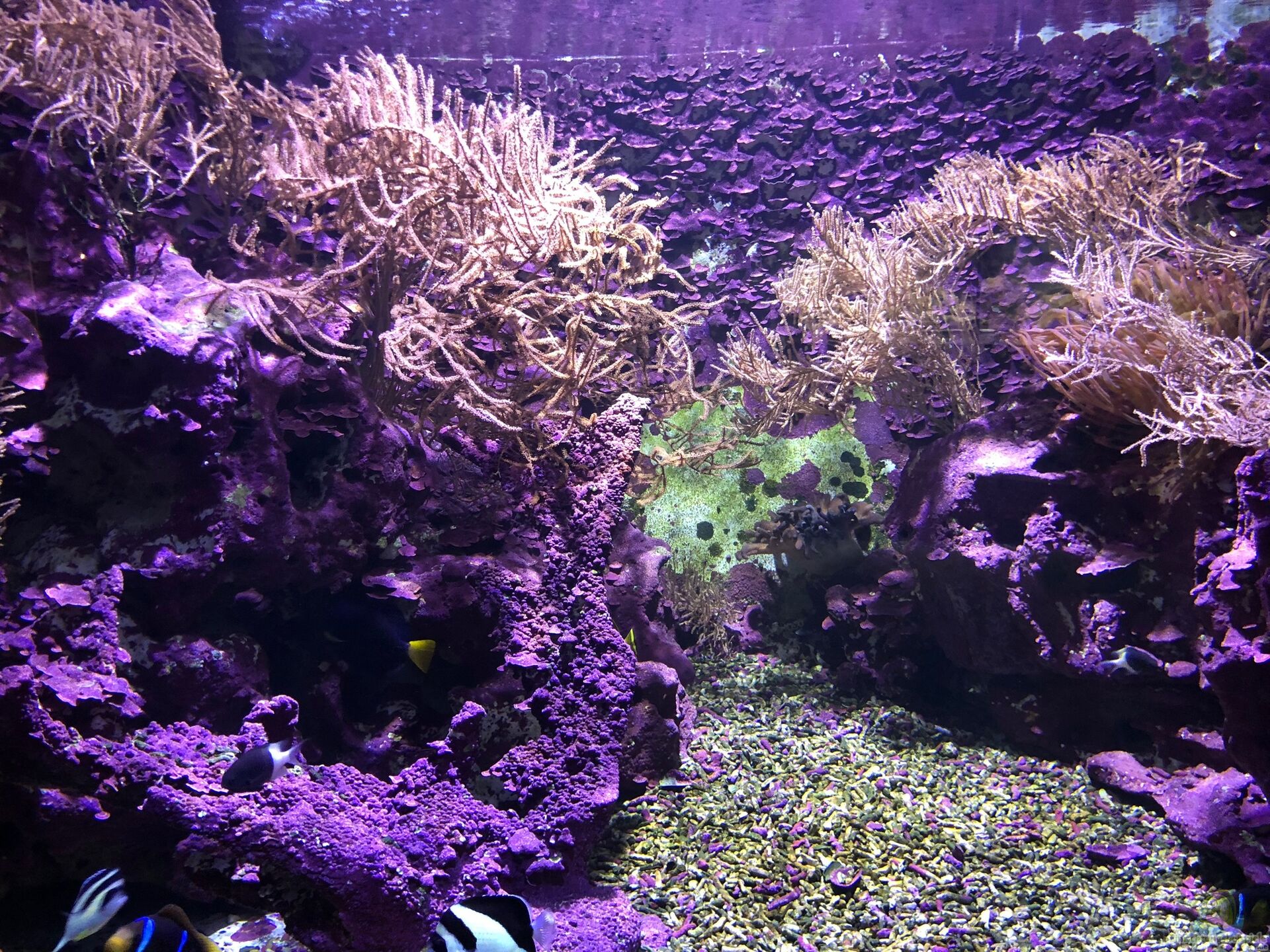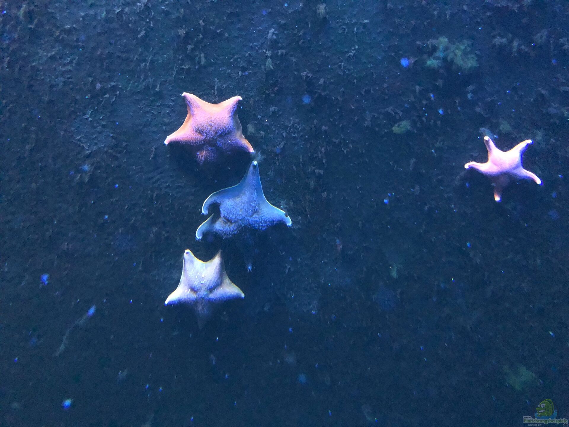 Die einzelnen Aquarien waren schön eingerichtet und die Fische lebhaft und zeigten tolle Farben. Manche Beckenbewohner waren ziemlich gro??, sie waren wohl schon längere Zeit im Aquarium beheimatet. Man sah von Anemonen-Fischen, kleinen bis grö??eren Barschen, Kaiser- und Falterfischen, Seesterne bis Seepferdchen und Muränen eine gro??e Vielfalt an Meeresbewohnern. Krebse und Langusten gab es auch und eine ??? ich nenne dies ???Quallen-Waschmaschine? Den Namen bekommt dieses Becken da es aussieht, als sähe man in eine Waschmaschinen-Trommel mit Strömung, die von blauem Licht durchflutet wird und viele Quallen tummeln sich in dieser Strömung, die sich im Uhrzeigersinn im Kreis dreht.