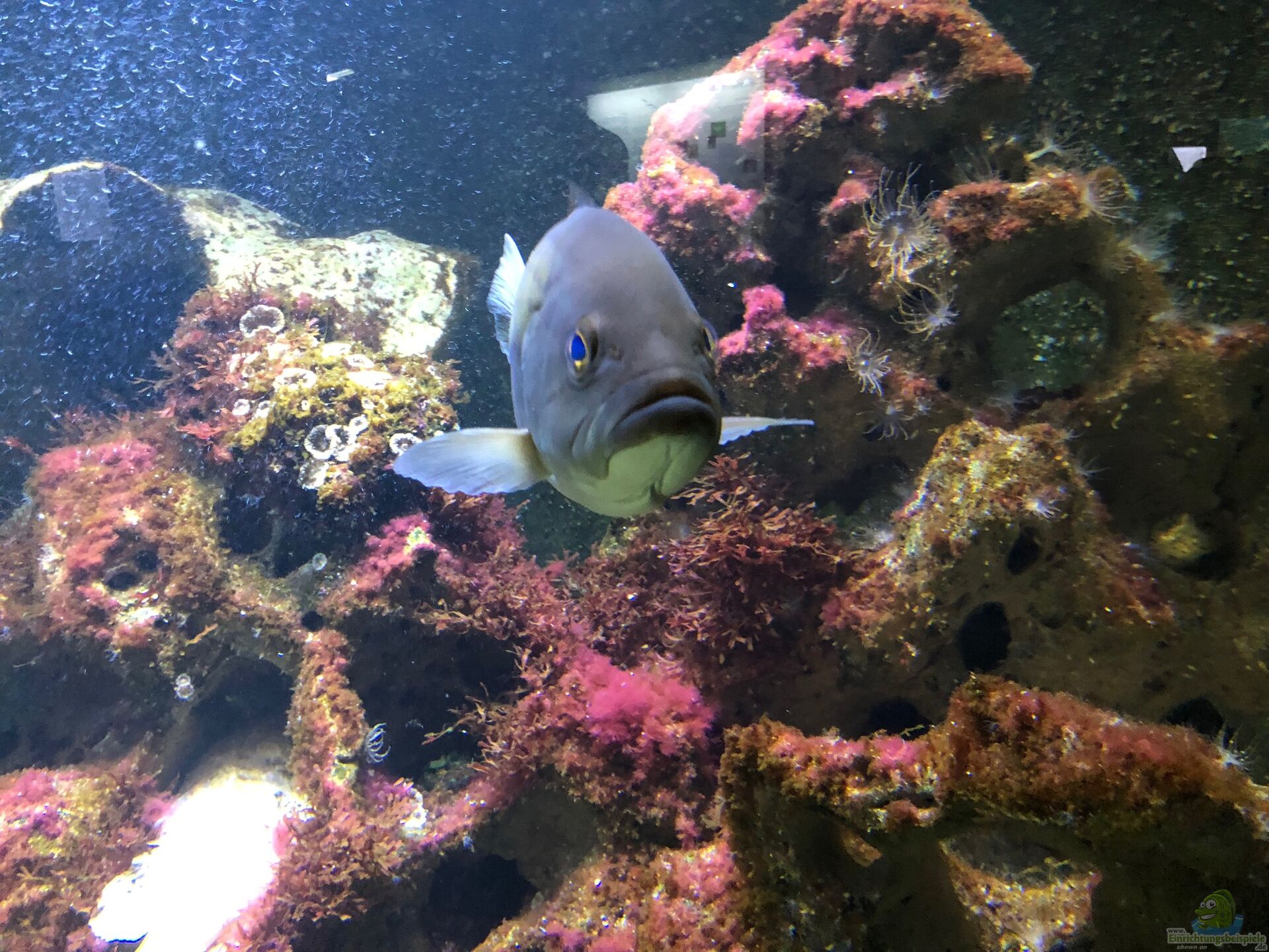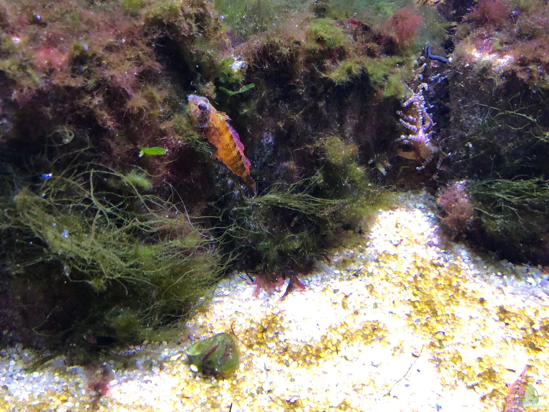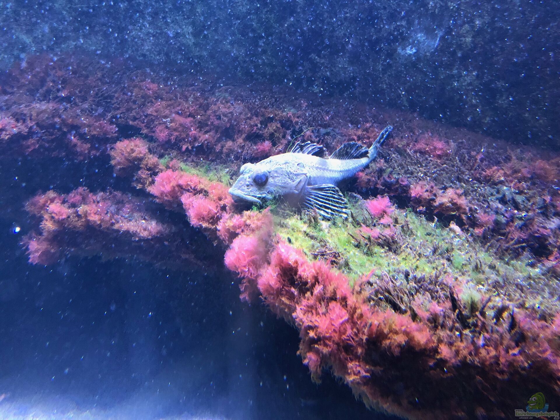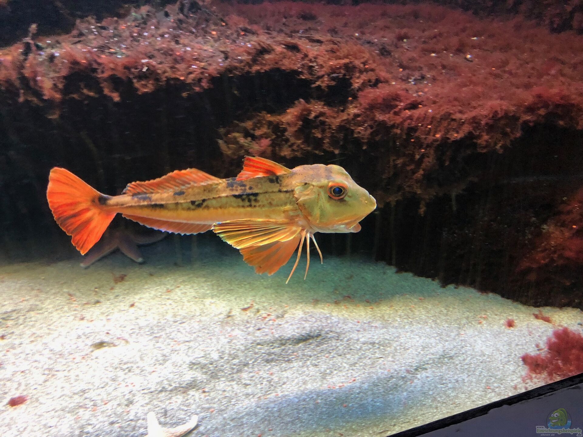 Besonders schöne Farben zeigte ein Knurrhahn, der in ???seinem??? Becken von einem kleineren, ???dicken??? Fisch, der gerne mal auf ???seinem??? Aussichtspunkt zu ???liegen??? schien beobachtet wurde. Leider wei?? ich den lateinischen Namen dieses Fisches nicht mehr. Der Knurrhahn hatte knallige Rot- und Gelb-Töne und zog im Becken seine Bahnen.