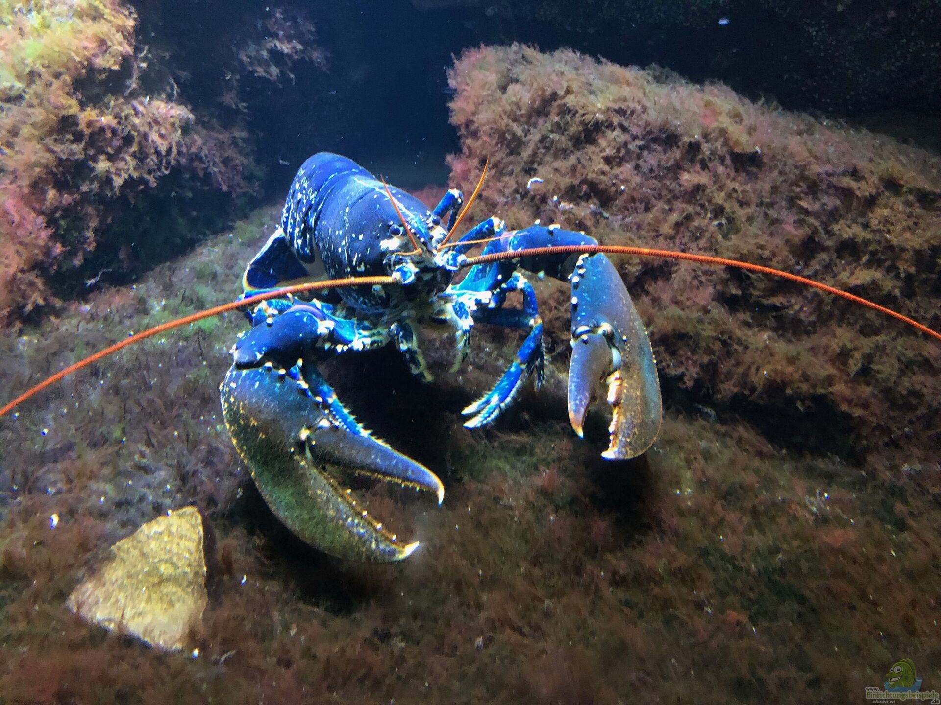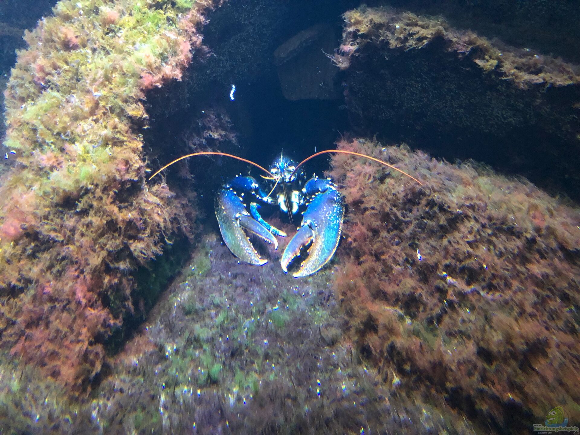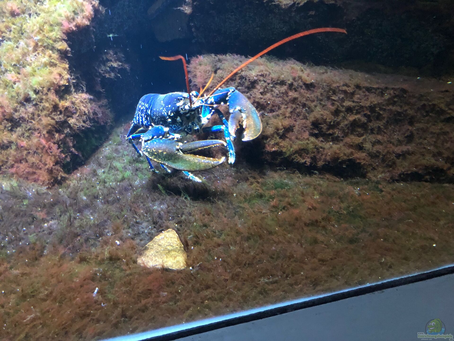 Besonders beeindruckt war ich von dem wunderschönen Exemplar eines europäischen Hummers in einem der Aquarien. Seine Beine glänzten stahl-blau und ebenso seine Körper-Schilde. Manche Partien waren in einem kräftigen Rostrot gefärbt. Der ???Soldat des Meeres??? sa?? in seiner Höhle und kam sogar ???extra für Einrichtungsbeispiele.de??? aus seinem Spalt, um sich fotografieren zu lassen. Ein prächtiges Exemplar, das jedoch nicht wirklich über 21 Grad Celsius verträgt und relativ langsam wächst. Es dauert schon einige Jahre, bis so ein Hummer 30cm hat. Heutzutage werden die möglichen 60cm leider nur mehr selten erreicht.