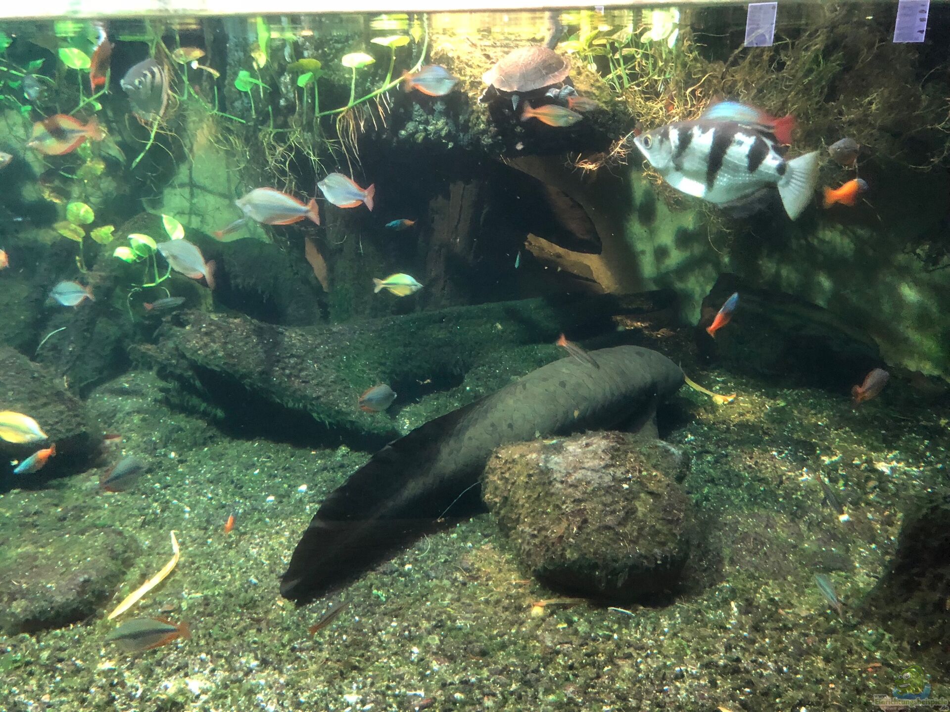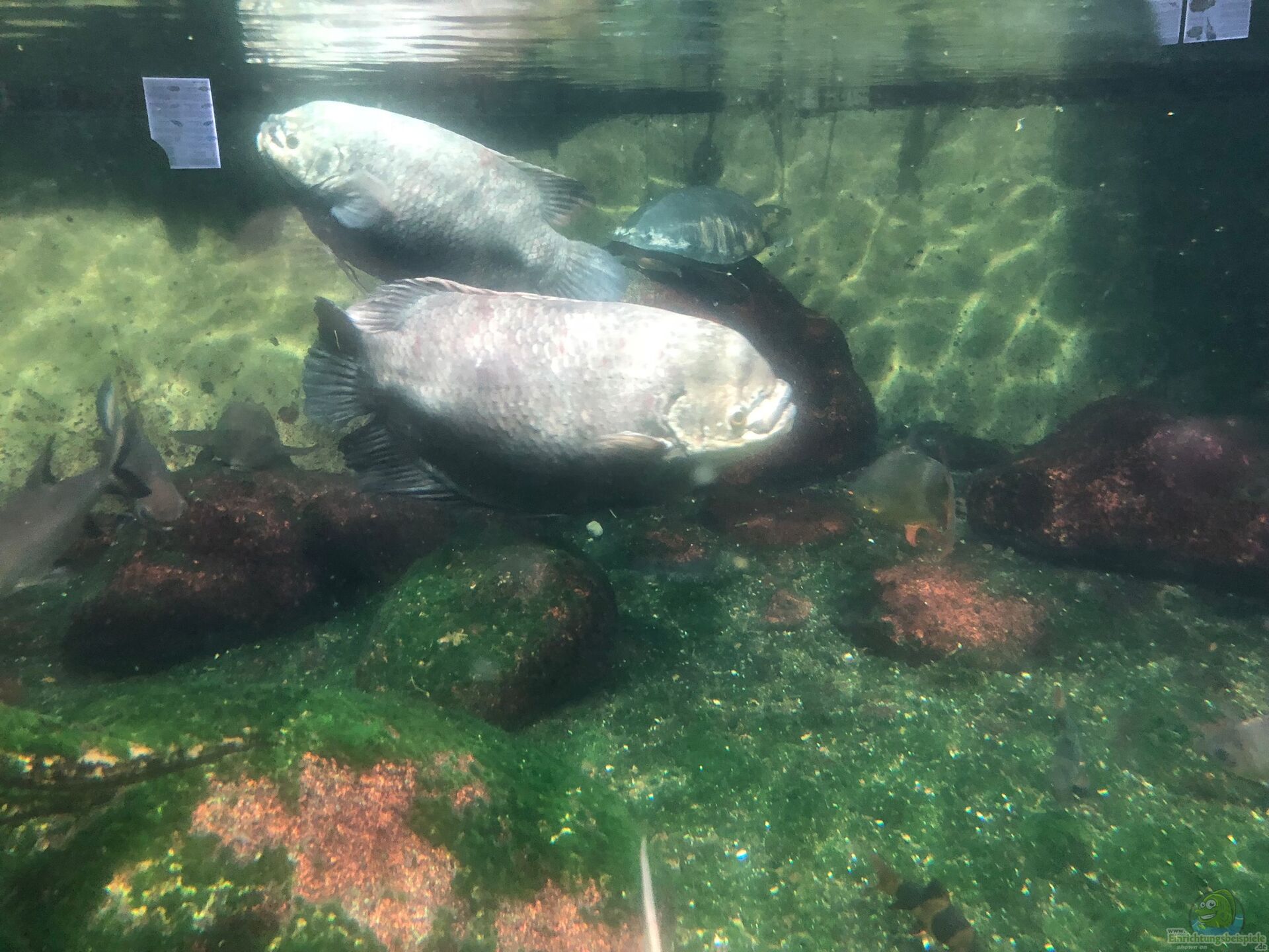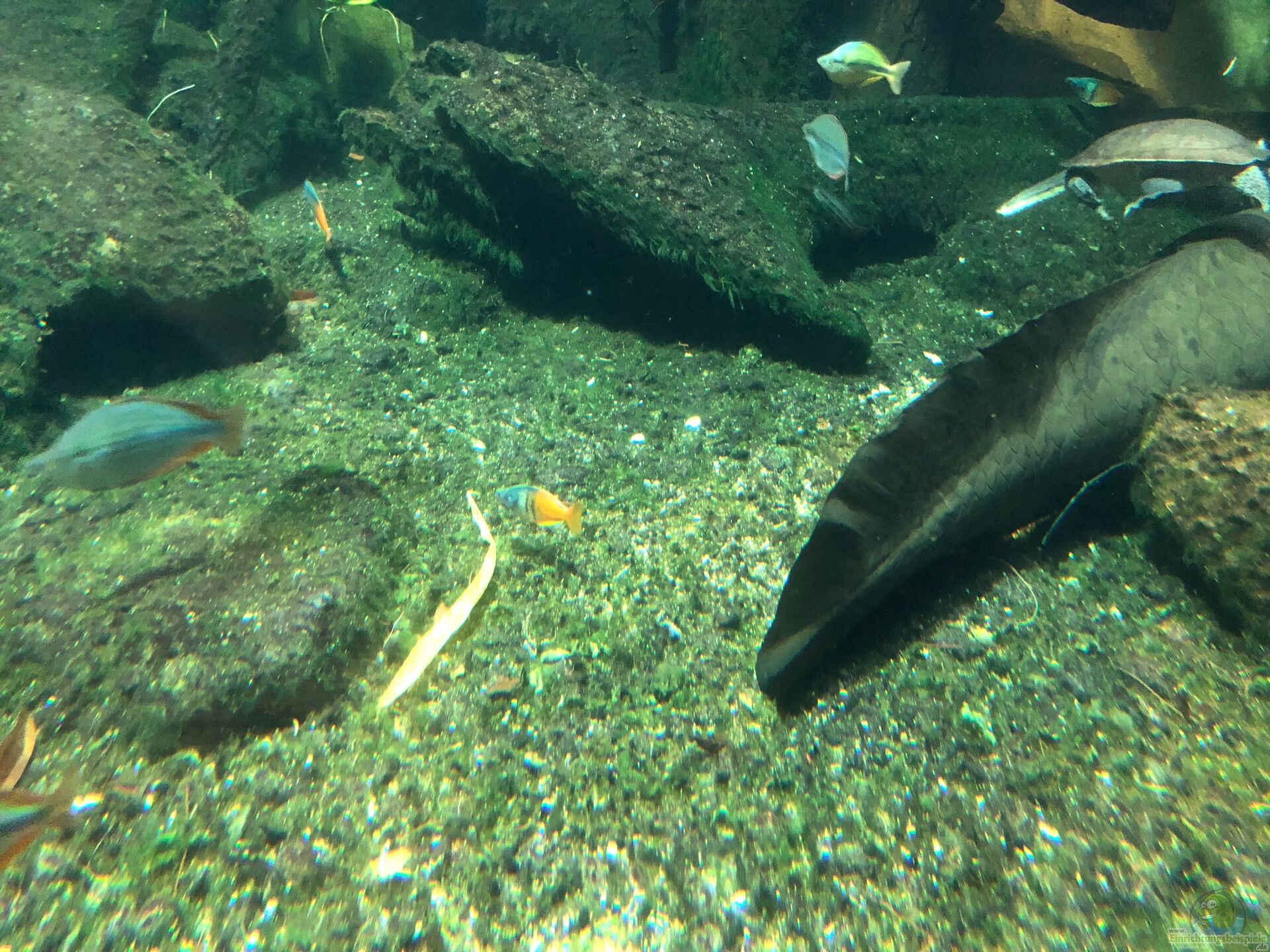 Ach ja, da wir eben bei gro??en Fischen sind??? Ein Becken, das man unbedingt besuchen sollte, das findet man im Amazonas-Glashaus, au??erhalb der Aquarien-Anlage. Hier kann man einen wundervollen, riesigen Arapaima und andere gro??e Vertreter aus dem Regenwald rund um den Erdball beobachten. Der Arapaima kann weit über 4m werden und wiegt dann um die 200kg. Seine schwarz-rote Färbung ist sehr ansprechend und seine Art zu schwimmen nahezu majestätisch. Tja, manche Tiere scheinen um ihre Ausstrahlung zu wissen und mir kommt vor, dieser Arapaima in der Wilhelmina gehört zu den besagten. In seiner Gesellschaft befinden sich Riesen-Guramis, Haibarben, Prachtschmerlen, gro??e Buntbarsche wie Kammbuntbarsche, über die in der Zeitschrift AMAZONAS Nr. 70 März/April 2017 ausführlich berichtet wurde und andere sehr gro?? werdende Fische, die nicht in die ???normale??? Aquaristik gehören.