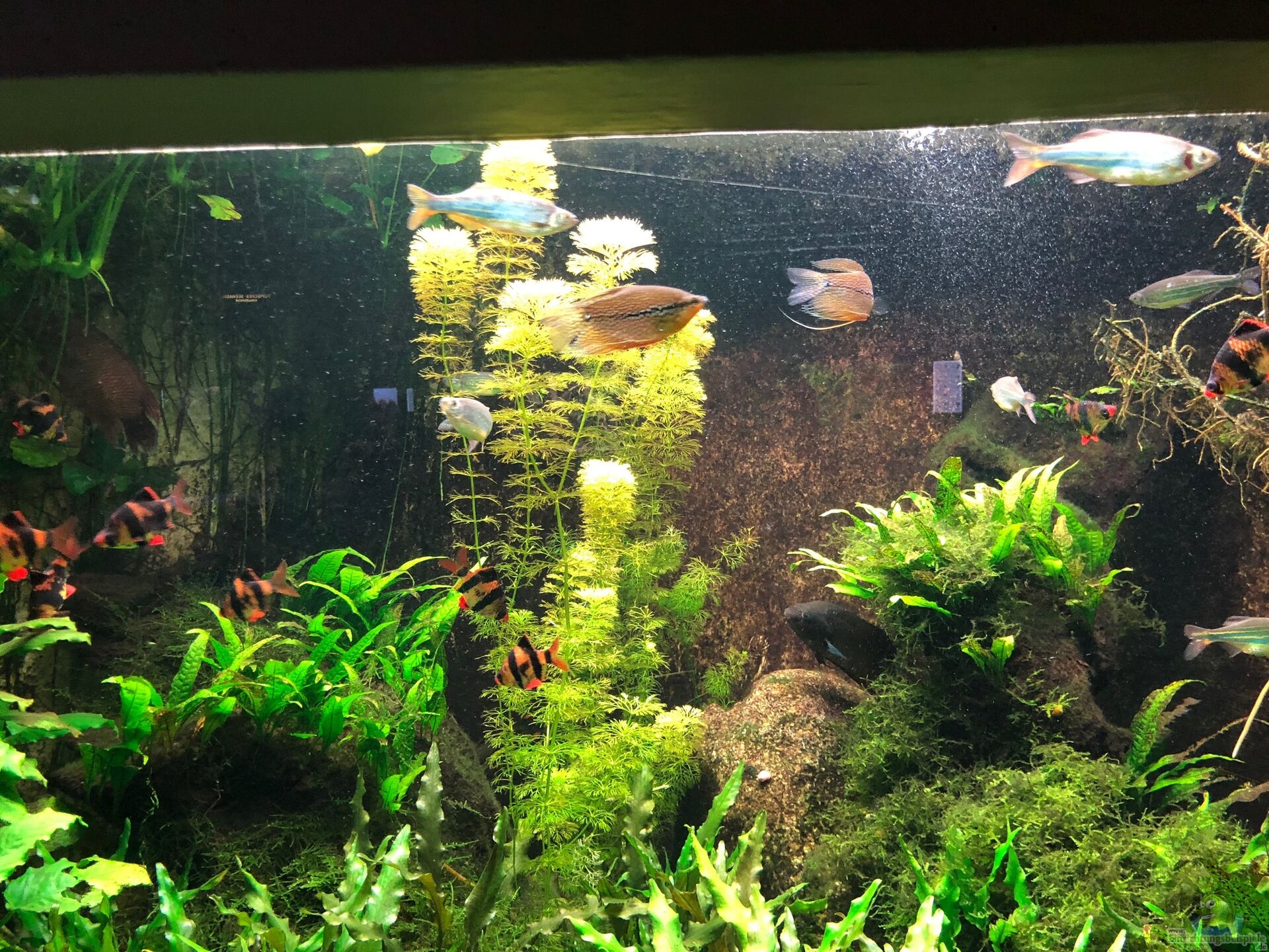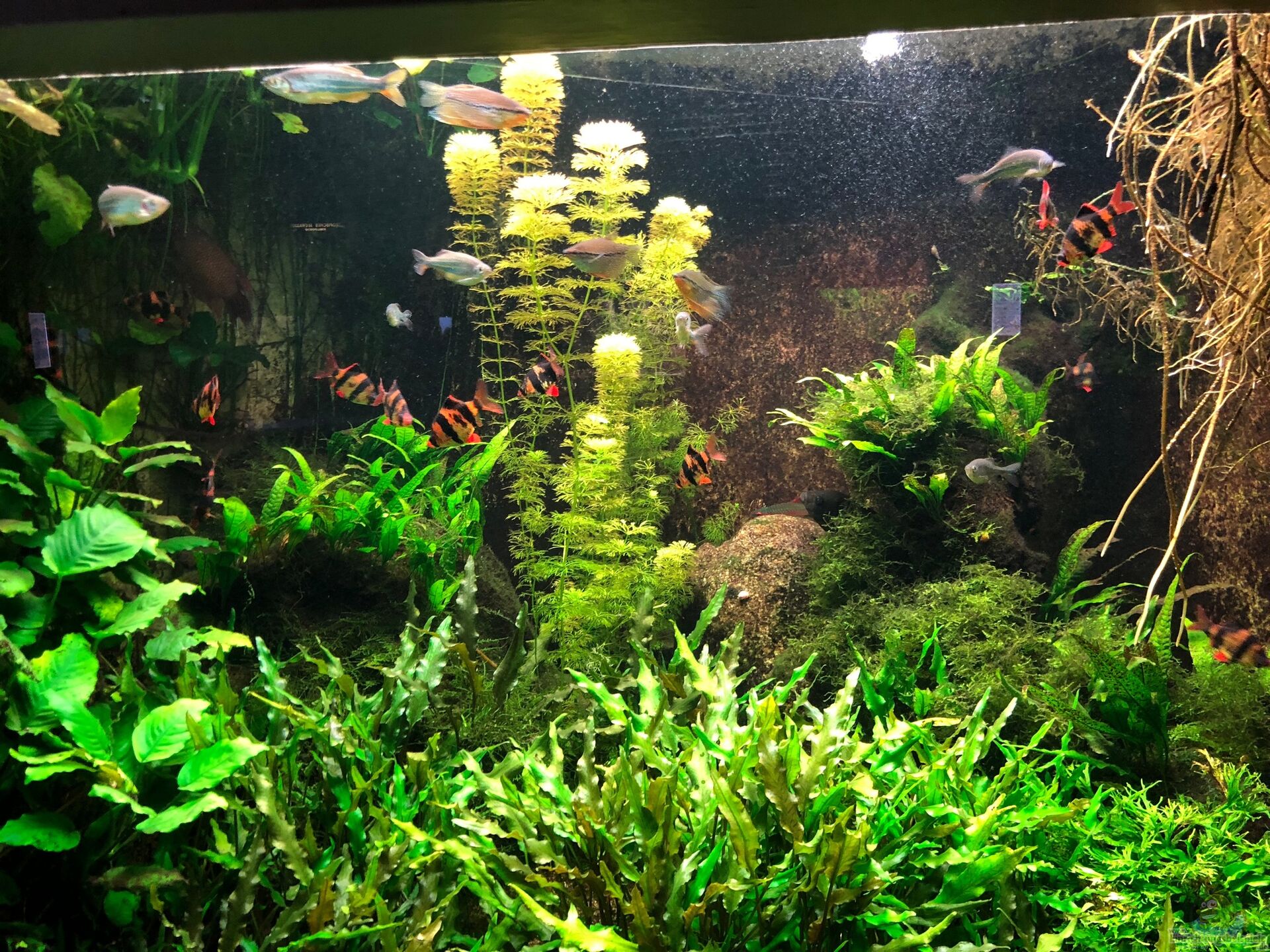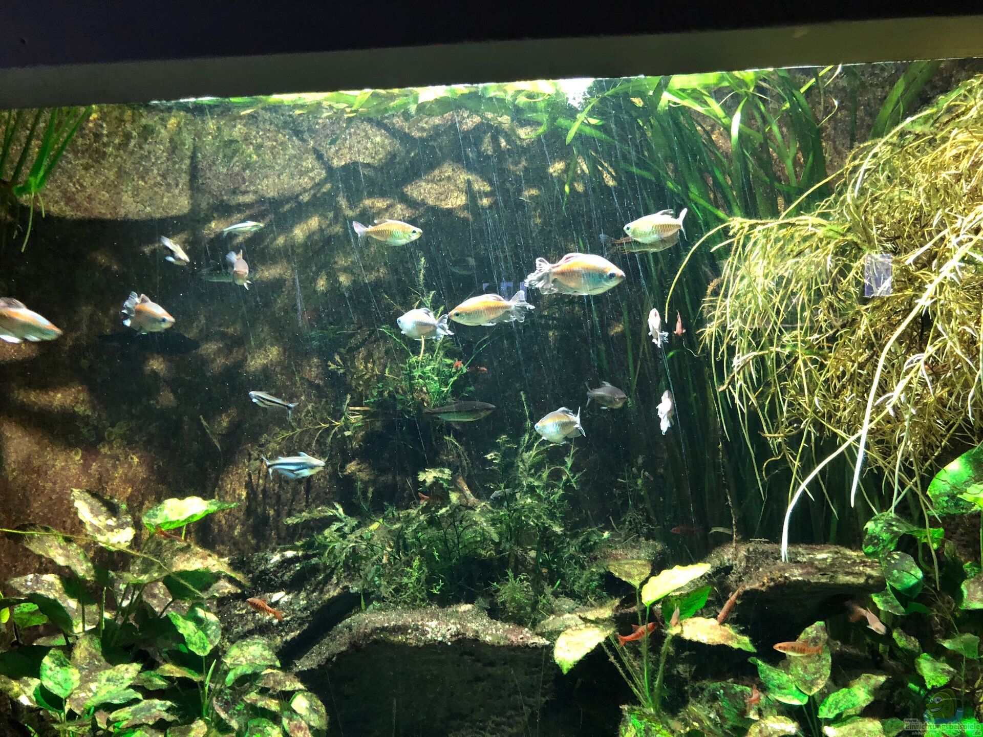 In einem Asien-Becken sah man einige Klassiker der Aquaristik miteinander vergesellschaftet, von der man sonst eher abrät. Hier waren Sumatra-Barben mit Mosaik-Fadenfischen und einigen anderen Fischen zu sehen. Beide erstgenannte Arten sollte man sonst nicht zusammensetzen, da die Sumatra-Barben gerne an längeren Flossen und Anhang, wie ihn die Mosaik-Fadenfische besitzen zupft. Doch in dem gro??en Zoo-Aquarium schien diese Vergesellschaftung zu klappen und die Barben waren in ihrer gro??en Gruppe (mehr als 15 Tiere) wohl untereinander so abgelenkt, dass sie die Fadenfische nicht belästigten.