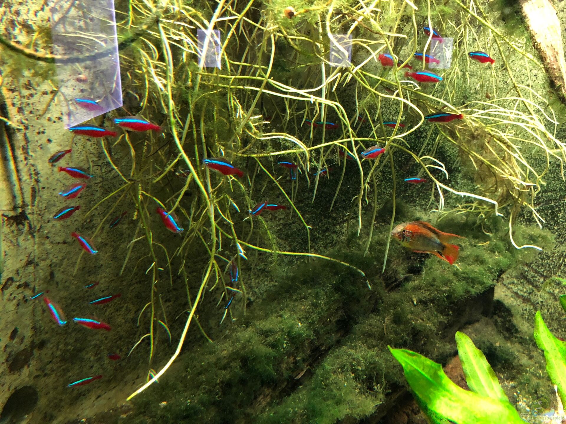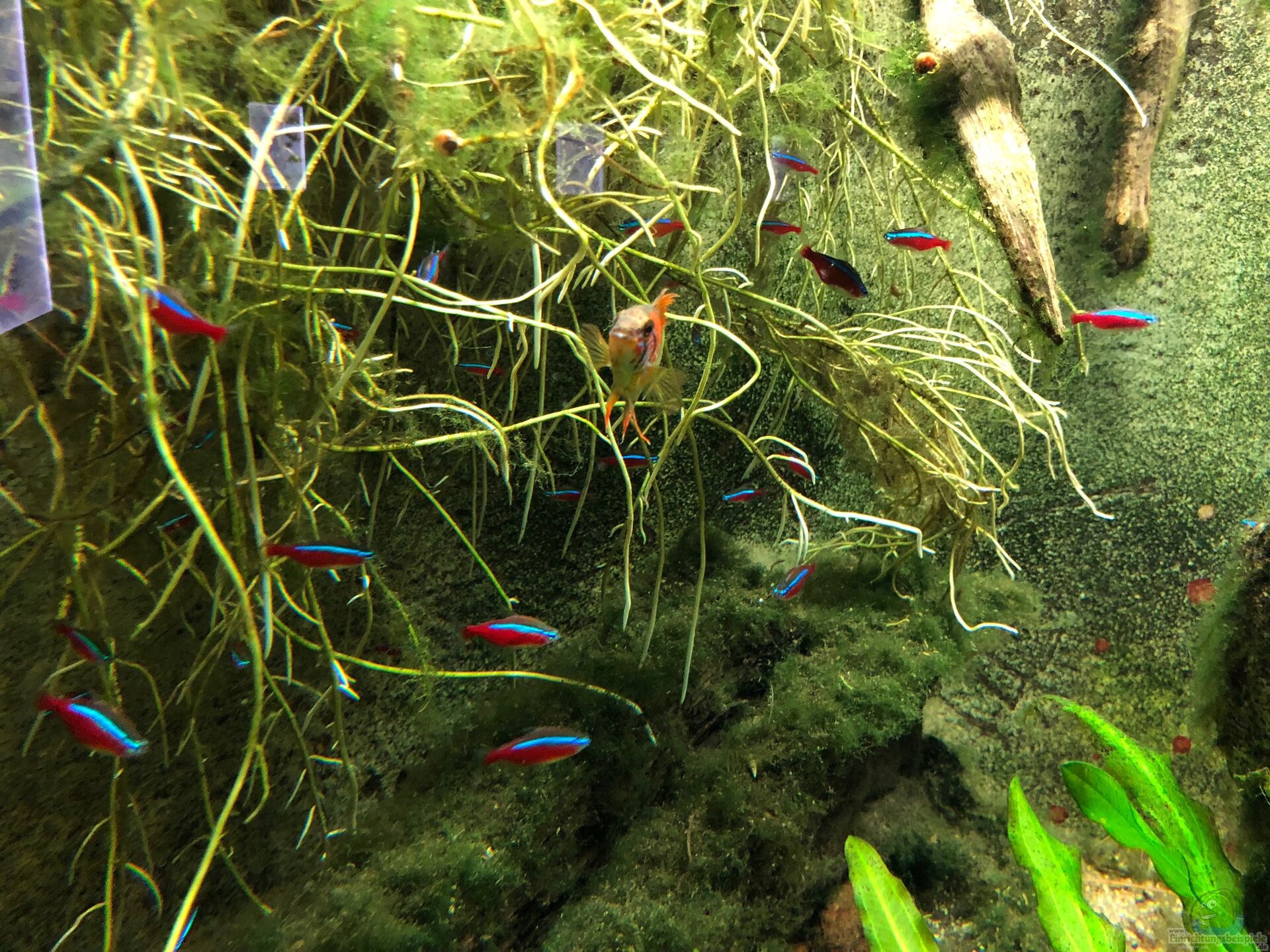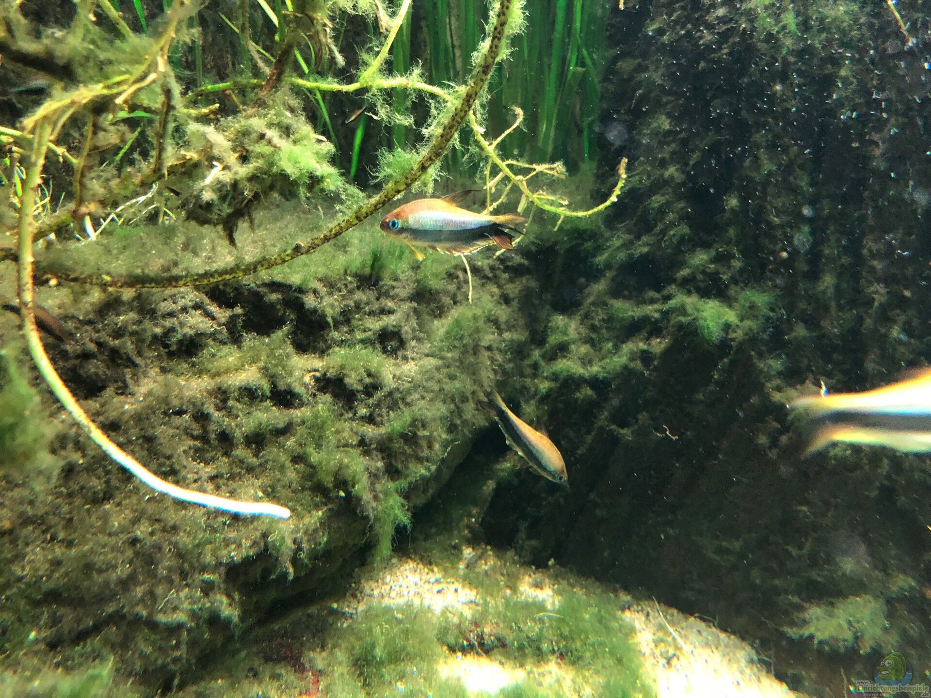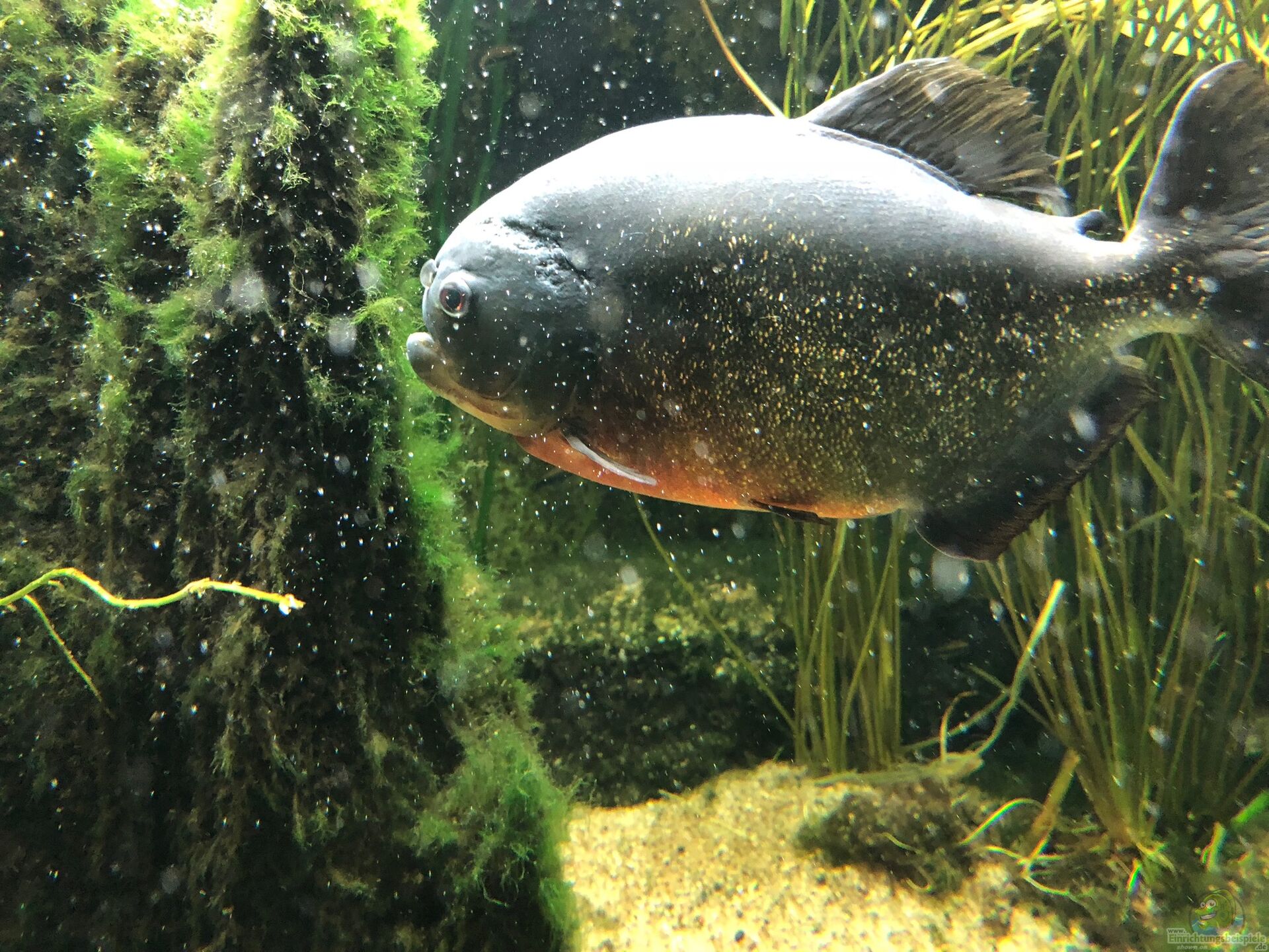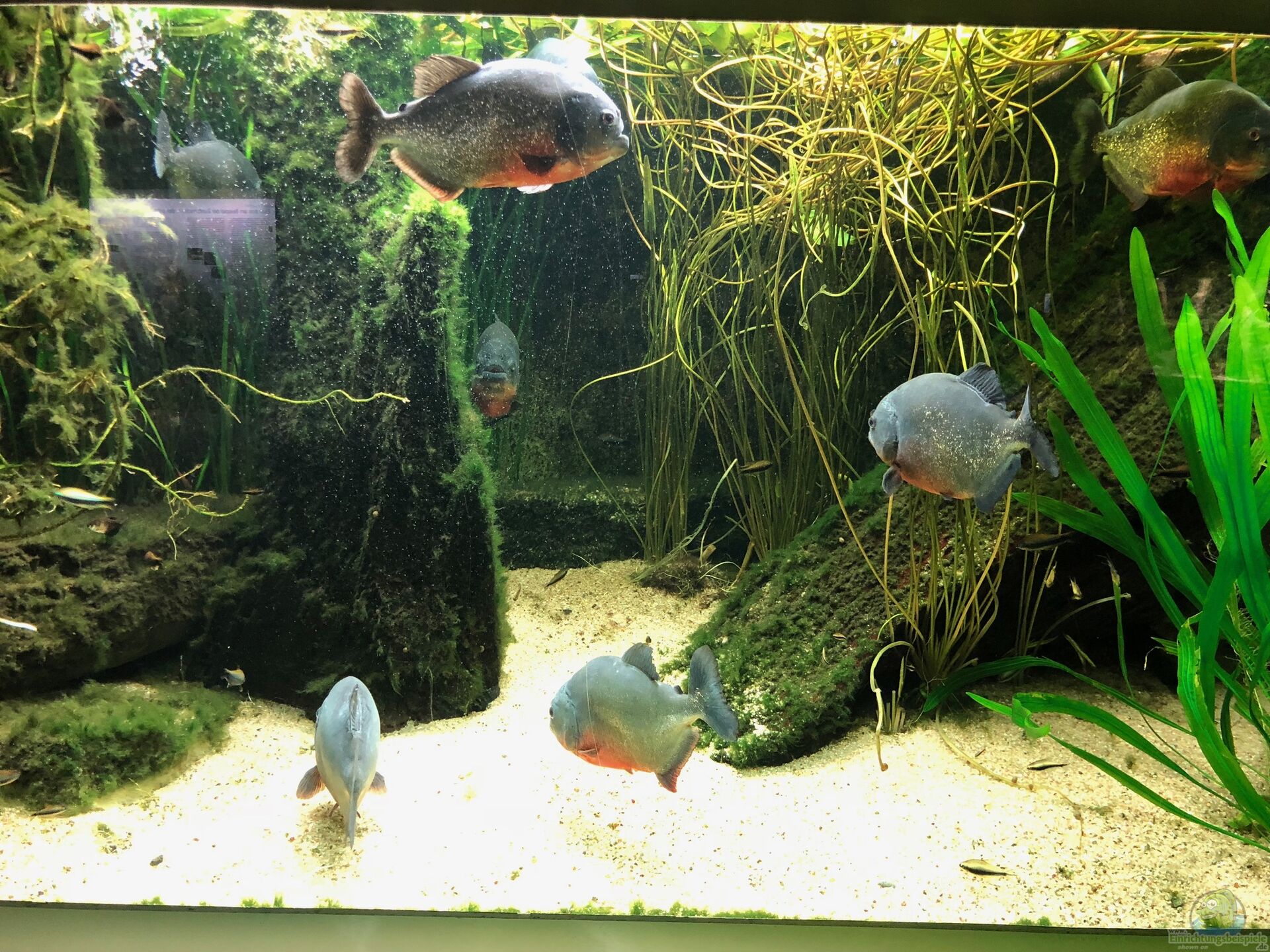 Man sah ein Becken mit gro??en Roten Piranhas und in einer Ecke dieses Aquariums hatten mehrere männliche Kaisersalmler ihre Reviere, die sie immer wieder gegenüber ihren Nachbarn verteidigten. Das war witzig anzusehen, denn neben den kleinen Salmlern schwammen diese gro??en Piranhas, die die Kleinen nicht beachteten.