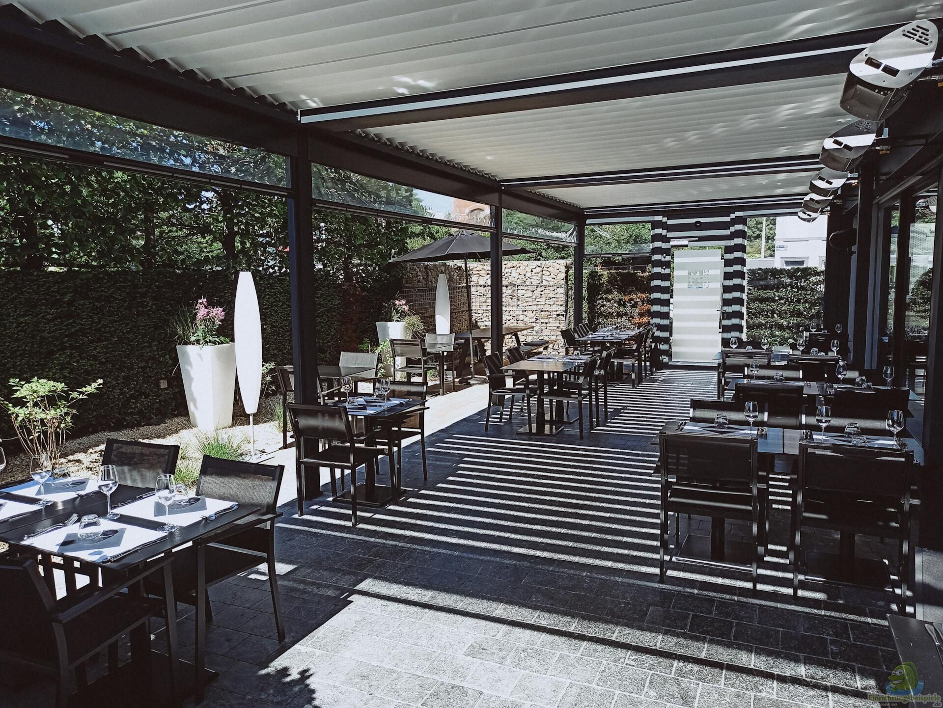 Glas ist modern und elegant. Es schützt effektiv vor Wind, ohne die Sicht zu versperren.