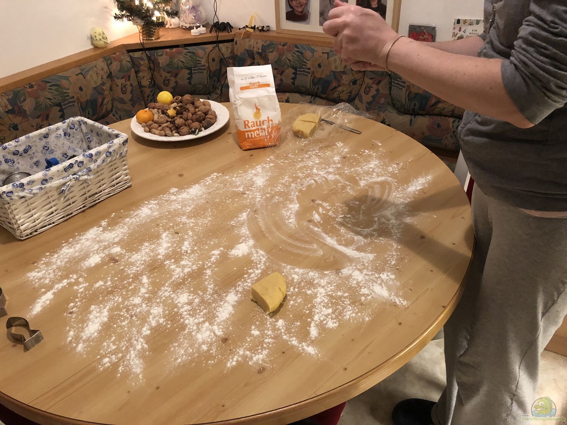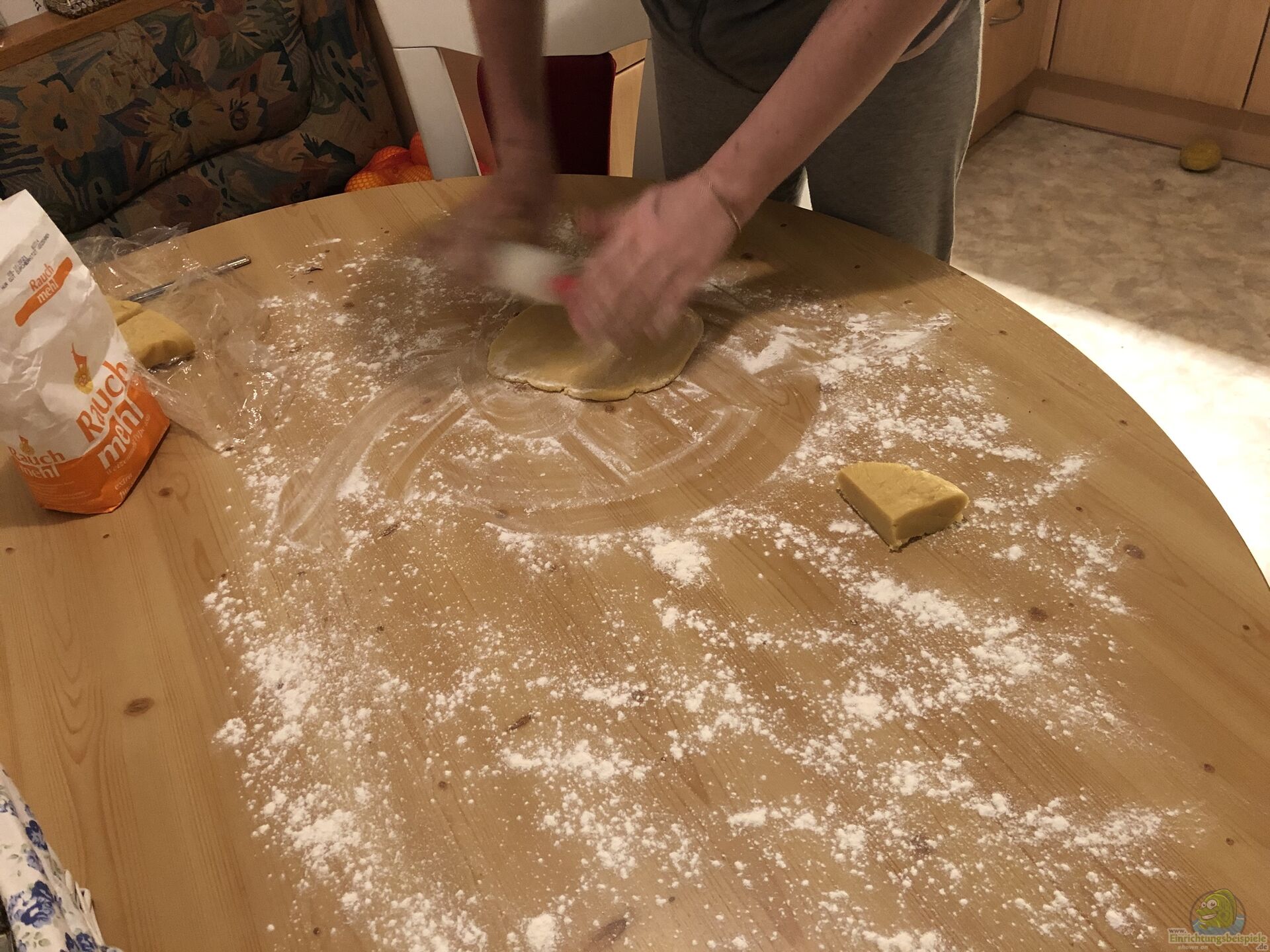 Dann bereitet man den Tisch vor (oder ??? wenn man hat ??? ein gro??es Brett), gibt auf die Fläche Mehl und walkt hier den Teig schön flach aus ??? aber Vorsicht! Zu flach sollte er nicht sein, da er gerne etwas mürb wird. Ach ja ??? auswalken wird auch als ausrollen bezeichnet. Wir sagen bei uns in Tirol übrigens ???auswalgen?