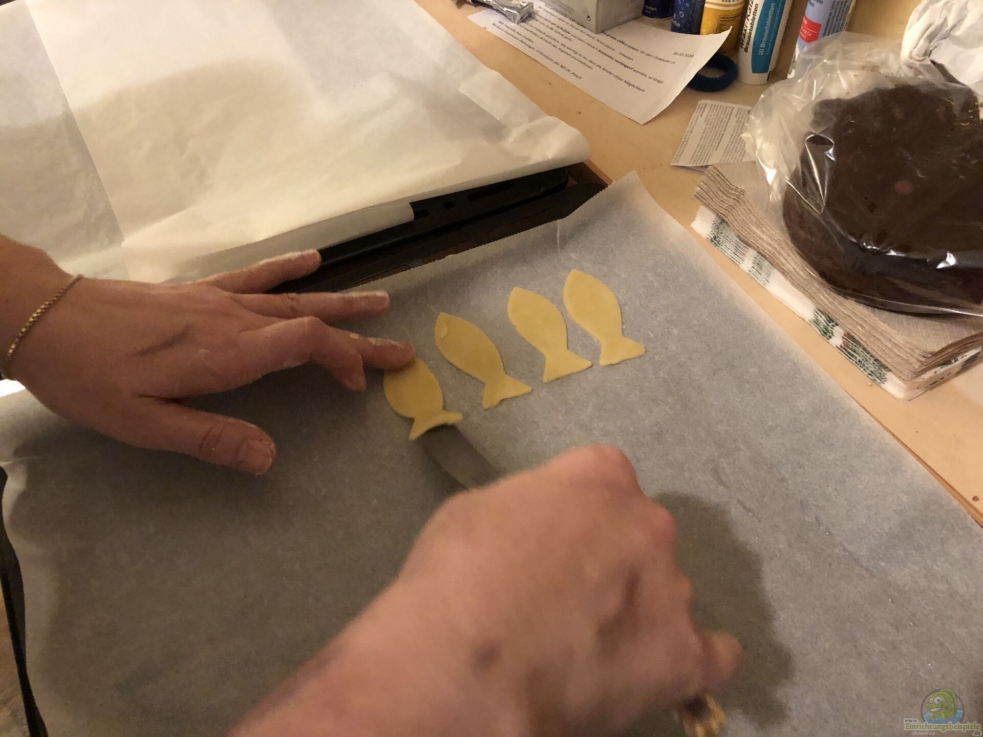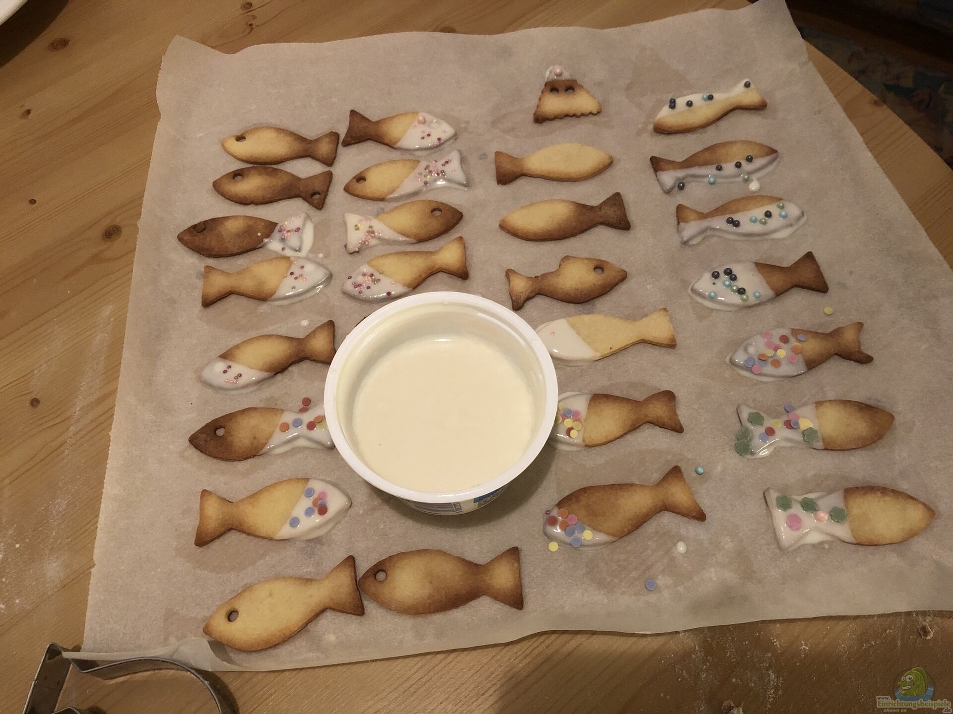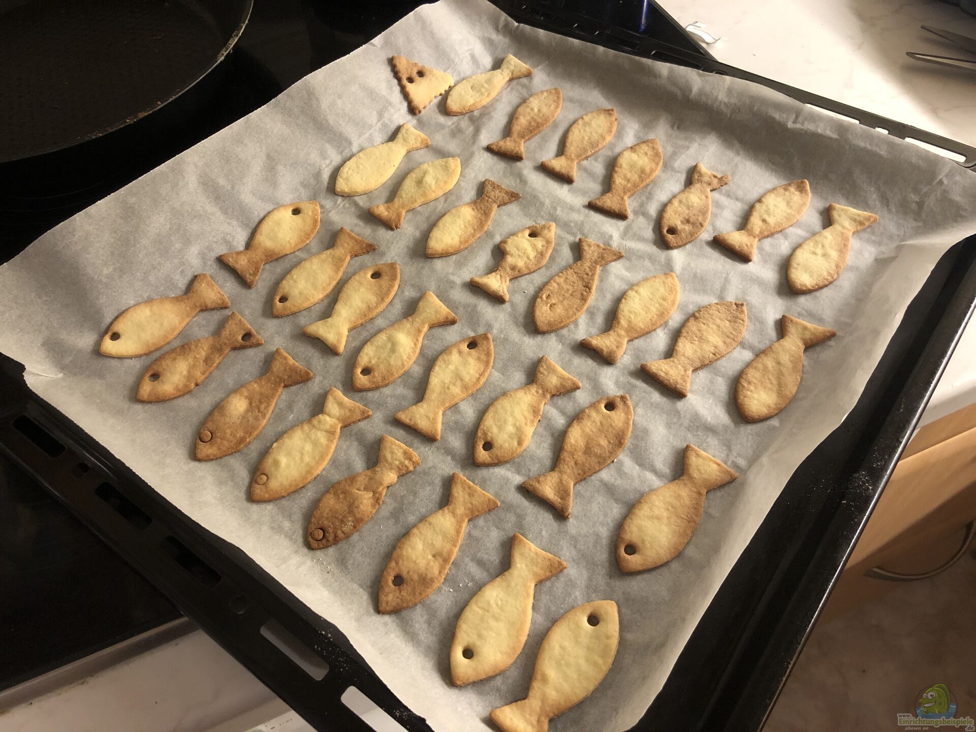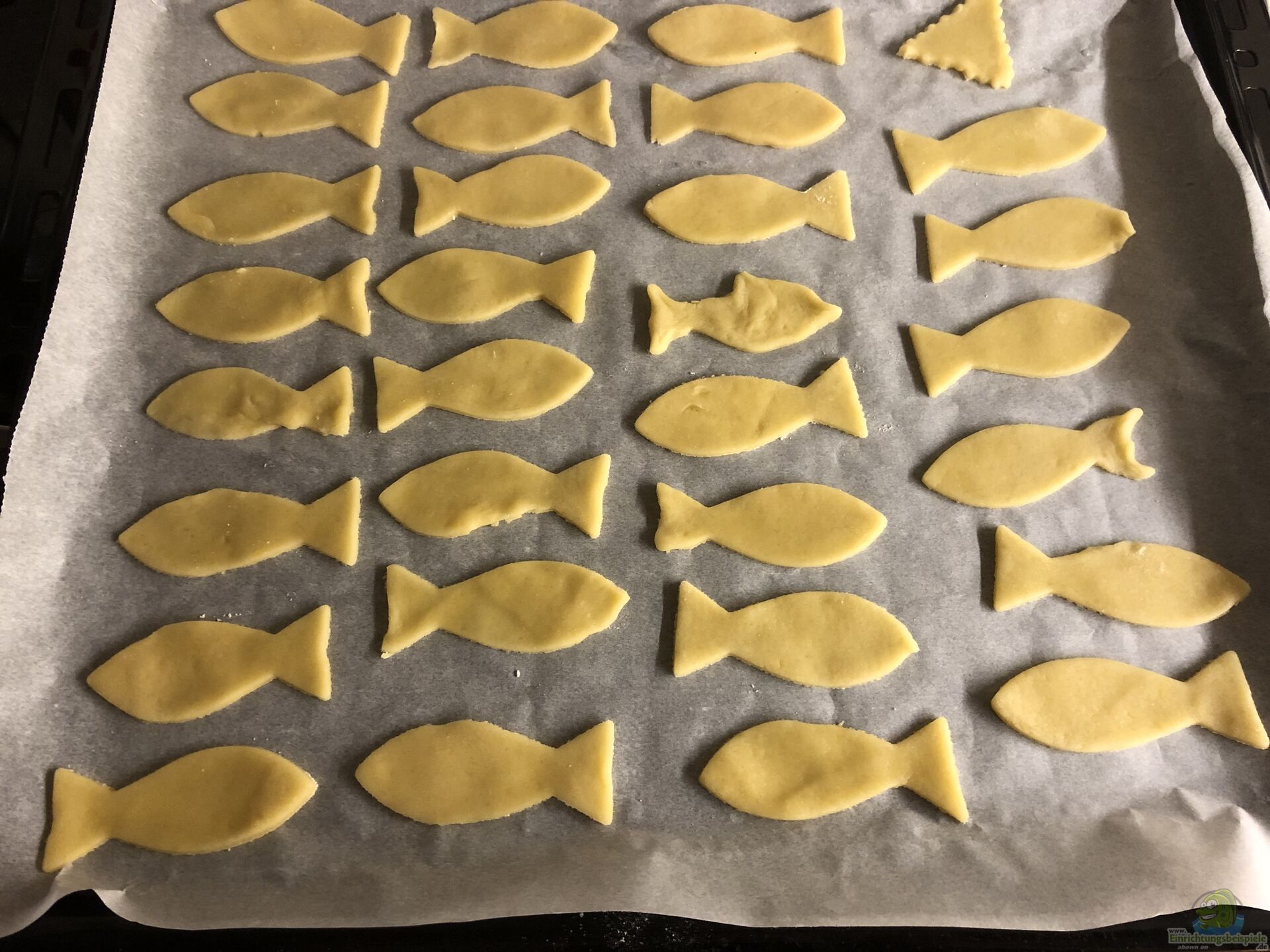 Natürlich haben wir in den Wochen vorher nach Fische-Ausstechern (Formen) geschaut. Es war gar nicht so einfach wie gedacht ??? aber wir haben welche gefunden. Am ersten Blech lagen dann auch nur Fische. Auf den anderen beiden Blechen haben wir auch weitere Formen genommen.