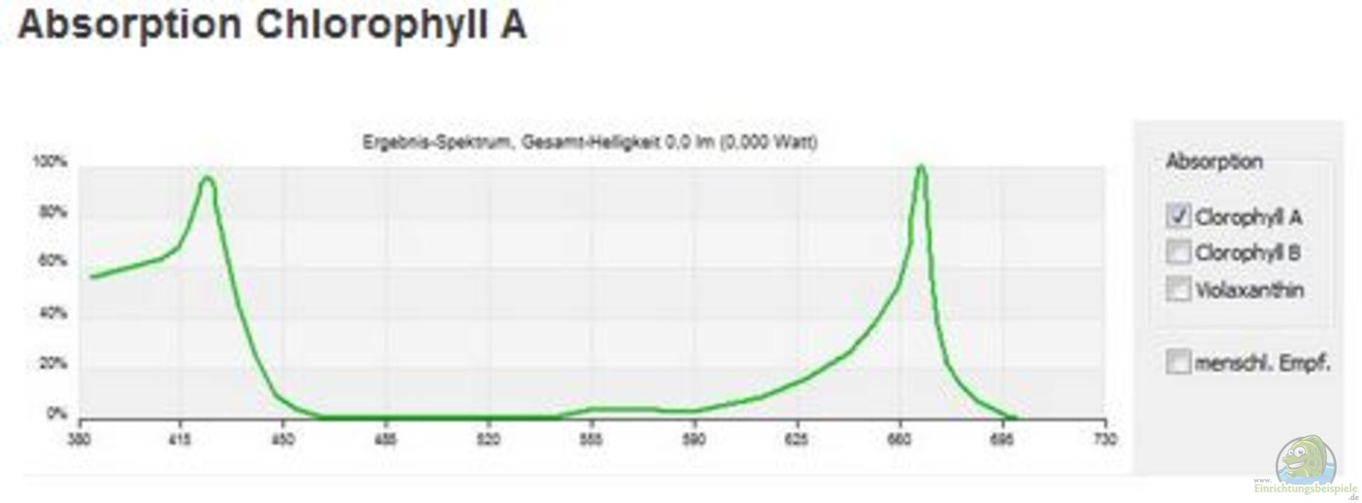 Die Absorption von Chlorophyll (a+b) liegt in den Wellenlängenbereichen von ca. 425-435 nm (Blau) und von ca. 655-665 nm (Rot), so dass die verbleibenden Farben des Spektrums des wei??en Lichts (alle Wellenlängen) das für uns sichtbare Grün ergeben.