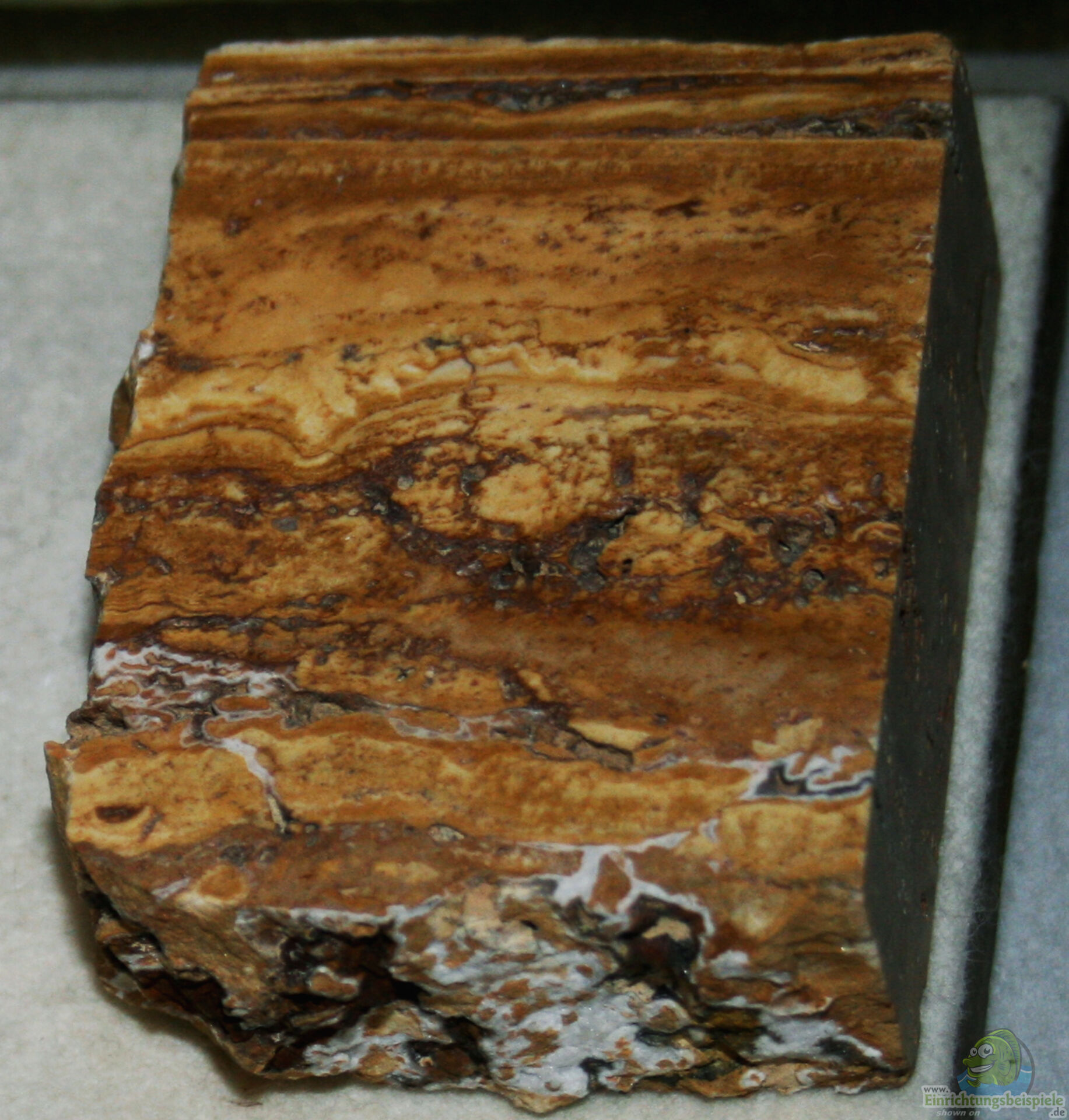 Travertin hat eine poröse Struktur und eine charakteristische Maserung. Es ist in der Regel in den Farben Beige, Creme, Braun oder Grau erhältlich. Die poröse Struktur entsteht durch das Ausgasen von Kohlendioxid in den kalkhaltigen Wasserquellen während der Ablagerung. Das Gas bildet Hohlräume im Gestein und verleiht ihm seine typische poröse Textur.