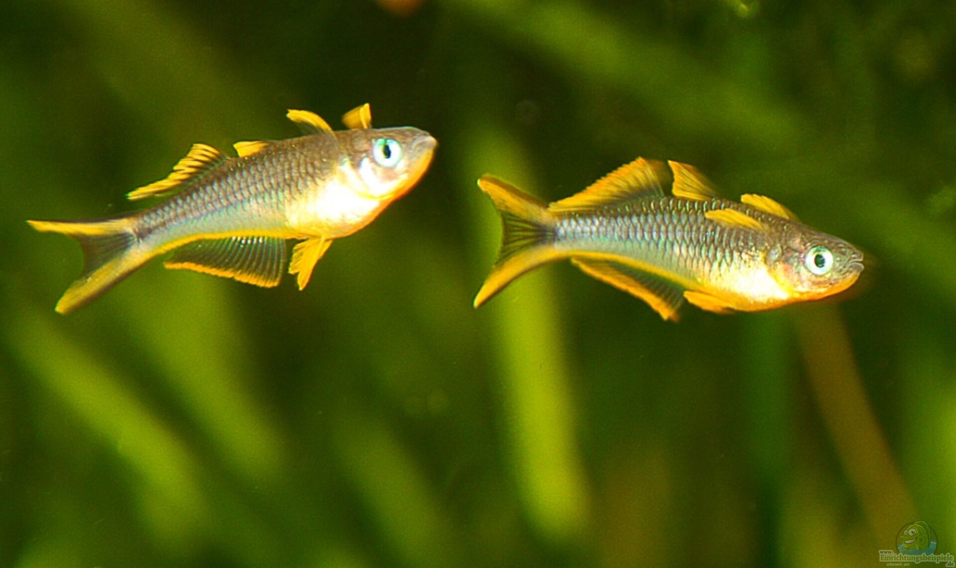 Geschlechtsunterschiede: Männchen ---> Bauch und Flossen sind in einem sehr kräftigen Hell - Goldgelb bzw. darüber und Umrandet wird dies mit einem tiefschwarzen Band rund um die Schwanzflossen. Die Rückenflosse wird bei Balz gewaltig aufgemacht die Brustflossen fallen durch ihre gelben Rundungen sehr stark auf. Der Bauchbereich strahlt (je nach Standortvariante) von Gelb - Orange. Grundfarbe ist ein silbriger Grundton