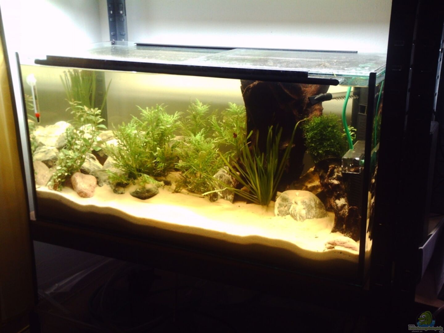 - Das Aquarium hat eine Glasabdeckung ( 2 Glasscheiben in einer Führung, wobei an einer Glasscheibe ein Eck fehlt um einen Durchlass für Kabel zu hinterlassen ) - Die Beleuchtung erfolgt über eine selbst gebaute Hängelampe. - Die Aufsätze am Filterausgang sind so gemacht, das der Regelheizer leicht umspült wird, während durch den Rest des Beckens eine hoffentlich akzeptable Strömung geht. - Das Becken steht auf einer Unterlegmatte, um mögliche Unebenheiten auszugleichen. - [...]