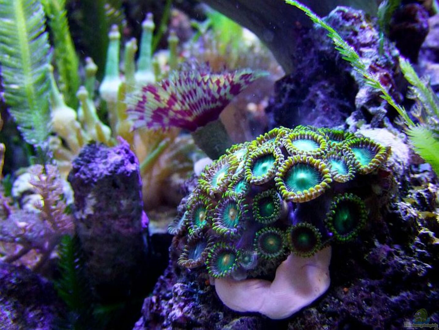 Korallen: * Zoanthus sp., unterschiedliche Färbungen. Erst nach dem zweiten Versuch klappte das Einbringen! Beim ersten mal wunderte ich mich, dass die Polypen nach und nach verschwanden... bis ich eine Heliacos-Schnecke absammelte und vor allem die dunkelgrauen Asterinas mehrfach beim gemütlichen Mampfen erwischte. Ich war mir nicht sicher, ob die kleinen Seesternchen nicht einfach nur die Gunst der Stunde nutzten und das Werk der Schnecke vollendeten- sprich, nur an bereits angeschlagenen Polypen [...]