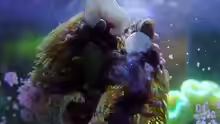 Korallen: * Zoanthus sp., unterschiedliche Färbungen. Erst nach dem zweiten Versuch klappte das Einbringen! Beim ersten mal wunderte ich mich, dass die Polypen nach und nach verschwanden... bis ich eine Heliacos-Schnecke absammelte und vor allem die dunkelgrauen Asterinas mehrfach beim gemütlichen Mampfen erwischte. Ich war mir nicht sicher, ob die kleinen Seesternchen nicht einfach nur die Gunst der Stunde nutzten und das Werk der Schnecke vollendeten- sprich, nur an bereits angeschlagenen Polypen [...]